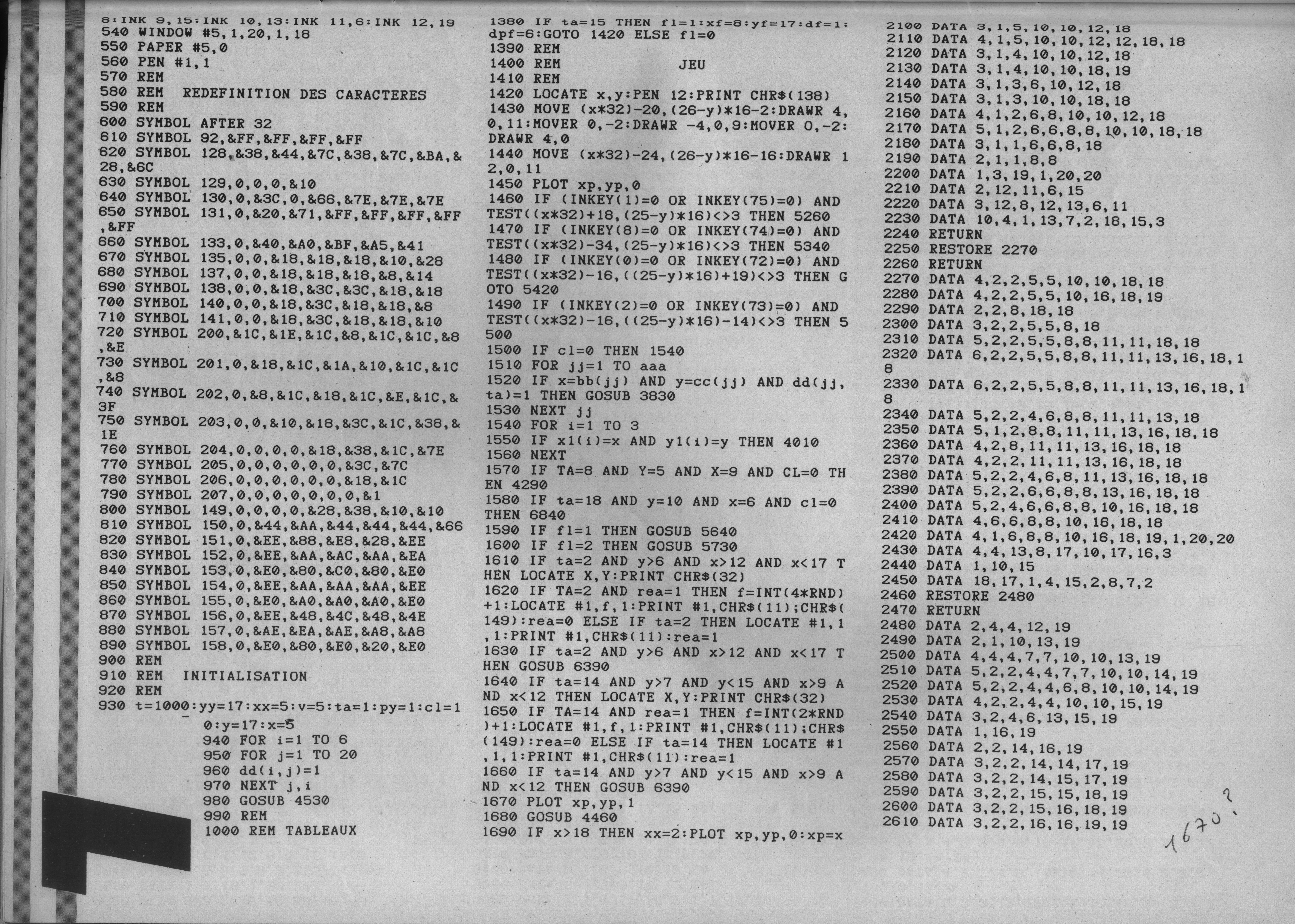En fait, a l'époque, j'avais envoyé mon listing a hebdogiciel mais entre temps hebdogiciel c'est arrêté et un journaliste est passé de hebdo a A100% et a récupérer mon code pour le coller dans le numéro 1 de Amstrad 100%. Le pire, c'est que je n'ai pas été prévenu ni payé pour ça ! Quelle surprise de voir mon code a l'achat du magazine ! Alors j'ai appelé la rédaction pour gueuler et au final j'ai été rémunéré 1000 francs (que je me suis empressé de dépenser pour acheter des jeux pour mon amstrad ) !
