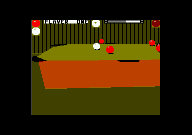 ET QU'EST-CE QU'ON VOIT? Un billard en 3D sur un CPC. c'est vraiment flashant. Vous pouvez tourner autour, voir les billes sous tous les angles, vous approcher du billard ou vous en éloigner, vous baisser ou avoir une vision de dessus, tout ça pour le même prix. L'avantage évident de la 3D pour une simulation de billard. c'est que ça facilite l'appréciation des coups. Vous voulez savoir si une boule se trouve bien en face d'un trou ? Pas de problème, vous faites le tour du billard, vous prenez en enfilade le trou et la bille et, sous votre regard ébloui, vous voyez que votre boule n'est malheureusement pas idéalement placée et donc qu'il vaut mieux tenter un autre coup.