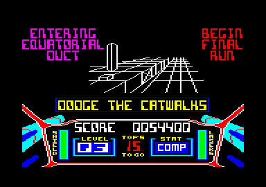Check list Après la page de présentation, vous vous trouvez dans le cockpit de votre vaisseau spatial. Il est alors temps de prendre connaissance de votre tableau de bord. Tout au long de votre mission, vous devrez constamment le consulter pour surveiller vos différents indicateurs de puissance. Le plus important est sans conteste celui qui indique la puissance de votre bouclier de protection, qui diminue en fonction des impacts directs que vous encaissez (cet indicateur se trouve à gauche de l'écran). Le second vous indique la puissance de votre laser (a droite de l'écran) ; il se recharge automatiquement, il suffit de lui en laisser le temps, mais cela vous interdit de tirer n'importe où, n'importe comment ; c'est un peu dommage parce que parfois ça souiage, je suis sûr que vous voyez ce que je veux dire... Options de Jeu Une fois que vous avez bien visualisé votre tableau de bord, vous devez choisir entre jouer au clavier ou au joystick. La seconde option est de loin la meilleure, et ce, pour deux raisons l'animation du jeu est tellement rapide qu'il est plus aisé de réagir au quart de seconde et. qui plus est, la gestion au joystick se rapproche assez du pilotage avec un manche à balai, il ne vous reste plus cu'â choisir le niveau auquel vous désirez commencer la partie. Quatre possibilités vous sont offertes, du plus facile au plus ardu. Si votre petite amie vient de vous quitter et que la vie ne vous paraît pas valoir la peine d'être vécue, choisissez donc d'entrée le niveau le plus difficile et je garantis que vous irez rapidement rejoindre le paradis des héros, sans même passer par la case départ. Le premier niveau par contre est tout indiqué pour débuter En tout cas c'est un excellent entraînement pour la suite des opérations: on ne devient pas l'égal de Luke Skywalker du jour au lendemain..