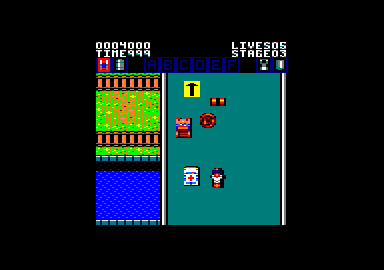 LUTTER D'ACCORD, MAIS AVEC QUOI ? Le gouvernement a mis à ma disposition le dernier bijou technologique créé par nos savants : un véhicule transformable qui est encore classé top secret. Cette petite merveille peut se transformer en moto ou en jet-car. N'étant pas un spécialiste des motocyclettes, je décide d'utiliser la voiture en premier. ÇA ALORS, UNE VOITURE Â DEUX ROUES ! Ben oui, je me suis fait des illusions : cette fameuse voiture, il va falloir que je la mérite ! Au commencement du jeu. je suis en effet placé d'office au guidon de la moto. C est seulement en récoltant les quatre bonus du premier niveau que je pourrai gagner le droit de piloter un engin à quatre roues ! Mais ne soyons pas défaitiste et voyons un peu ce que la bécane a dans le ventre. Elle n'est pas trop mal cette moto, du moins assez simple d'emploi pour un pilote inexpérimenté comme je le suis : elle ne comporte que deux vitesses, une lente et une rapide, auxquelles vous pouvez accéder au moyen des touches O et K ou des positions haut et bas du joystick. L'embrayage est automatique et ne posera donc aucun problème aux débutants : vous pourrez infliger tous les outrages à votre moteur sans risquer la traditionnelle surchauffe du moteur ou la panne d'essence.