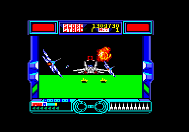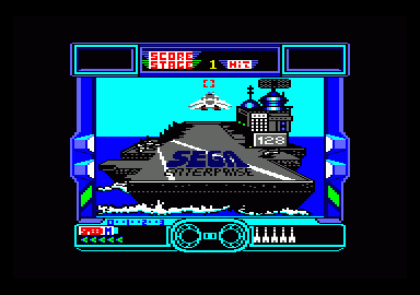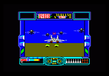 EN RANG SERRE C'est que, plus on avance, plus les ennemis arrivent nombreux. Au début les missiles ne sont pas trop durs à éviter, lorsqu'il vous en arrive un, vous le repérez au bruit et il sutïït de donner un petit coup de joystick vers le haut ou vers le bas pour passer à l'aise ( ou à côté, suivant les cas). Mais après, c'est un vrai déluge de fer et de feu. Ils se mettent à les tirer en escadrille et, quand cinq missiles vous arrivent dessus, c'est plutôt impressionnant. Quand on va un peu plus loin, c'est encore plus délirant, parce que. au lieu de lancer les missiles en bloc, ils s'amusent à vous les envoyer décalés, dans toutes les directions. A vous de parfaire votre slalom. Bon. il serait peut-être temps que je me pose. J'ai une envie pressante, que voulez-vous, avec tant d'émotions... Voilà justement la , première piste, mon avion atterrit, des camions-citernes font le plein. Jusqu'à la petite moto de Super Hang On qui vient saluer mon départ, entre grands, je parle des arcades, parce que pour les adaptations sur CPC. la comparaison est vraiment impossible.