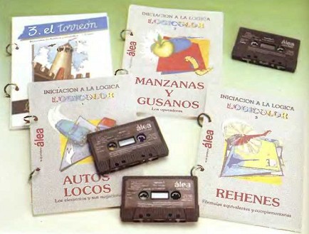 En esta ocasión , solimos fuera de los temas tradicionales que suele ocupar el software educativo, como puede ser el cuerpo humano, geografía, , economía ... , a lo que estamos tan acostumbrados, para adentrarnos en el terreno de la lógica. Sí, efectivamente, lógica para los niños. Debido a la abstracción y a la ca pacidad de razonamiento que precisa la lógica, las edades que son aconsejadas para los programas que nos ocupan a continuación se sitúan entre los 10 y 12 años, aunque el limite superior se puede elevar hasta los 99. ¡Por cierto!, todavia no hemos mencionado a los culpables de la realización de un programa que se salga fuera de los contenidos meramente escolares. es ALEA. Una empresa que promete. si sabe mantener, o mejor, au mentar, la linea de calidad de sus productos, óptimo porvenir. Además del paquete de lógica, cuyo nombre es «Iniciación a la lógica: LOGICOLOR» (con tres programas), existe otro más de aprendizaje de lecto-escritura (con cuatro programas) y se encuentra otro en preparación sobre técnicas de estudio (algo muy lógico, antes de estudiar hay que estudiar cómo hacerlo). En todos los casos, los programas que forman parte de cada paquete se pueden adquirir por separado, aunque consiguen tal nivel de adición que es prácticamente irrefrenable el deseo de hacerse con todos. ¡QUE CHULADA! Si en casi todos los programas pasamos directamente a comentar lo que hace y su calidad en ofrecer los contenidos, en esta ocasión no nos queda otro remedio que referirnos a la presentación de cada programa de ALEA. El programa se vende en una cajita de plàstico irrompible transparente, sellada (para evitar pirateos «pre-venta». una garantía para el comprador, aunque con el inconveniente que puede impedir echar un vistazo a las instrucciones para saber si nos conviene ese programa o no), en el que se encuentra el equipo completo: cásete con el programa, instrucciones, cinco làpices de colores, gema de borrar y sacapuntas. Como podemos comprobar, se entrega el EQUIPO COMPLETO. Va era hora que encontráramos alguien que se le ocurriera una presentación diferente a la típica caja de video, que aunque no es mala, ya está muy vista. Sin embargo, la cajita transparente. con su contenido, es otra cosa, está hecho para entrar por la vista. Con respecto a las instrucciones, rápidamente comprobaremos que han sido confeccionadas a prueba de niños (si es que hay algo que se pueda considerar «anti-niños»). Las hojas no son de papel, como seria lógico figurarnos,sino de cartón, más duras. Muy importante sobre todo, como veremos más adelante, si van a ser usadas por los propios alumnos.