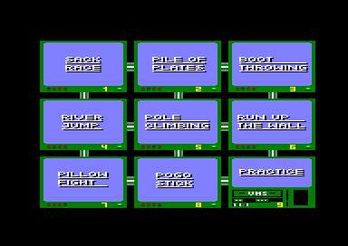L'AMBIANCE EST AUX FRITES Non. je ne vous parle pas ici des stands frites-merguez, mais de la course la plus éprouvante de tous ces jeux, la course en sac. Dans une rue pavée, deux concurrents se livrent un duel sans merci, arbitré par un chien et quelques plaques d"égout. Bonjour le malaise ! il n'est vraiment pas facile de garder son équilibre dans de telles conditions. Le but n'est pas de bouger son joystick le plus rapidement possible, mais le plus régulièrement possible. Avis aux musiciens, gardez le rythme. UNE COURSE QUI TOMBE EN PILE Après la traditionnelle course des serveurs de café, voici maintenant la course des piles d'assiettes. Avant le départ, chaque concurrent choisit la taille de sa pile. Ici, il n'est plus question de faire de la vitesse, mais d'amener le maximum d'assiettes au bout du parcours ; bien sûr, plus la pile est haute, plus il est difficile de ne pas en faire tomber. En déplaçant le joystick, on essaie de garder l'équilibre de la pile d'assiettes. Gare à la casse ! UN LANCEMENT QUI ME BOTTE Vous trouverez peut-être que je ne m'étends pas sur les épreuves, mais il faut bien que je les mentionne toutes, sinon vous allez encore dire que vous n'êtes pas suffisamment informés. Attention, la troisième épreuve est celle du lancer de botte. Non, je suis très sérieux, il faut lancer des bottes vides ou pleines d'eau au choix. Une partie de rire en perspective. Bon, je passe tout aussi rapidement sur la suivante, le saut de rivière. Il faut franchir une rivière à l'aide d'une perche, que Ton plante en plein milieu de celle-ci. C'est assez sympa mais pas transcendant.