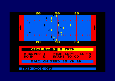 The Spectrum version of American Football was considered to be quite a good representation of the famous american sport and luckily its conversion to the Amstrad is reasonable. The aim of the game is to get the ball into your opponents 'endzone' and score a touch down. Your team is split into two distinct units, the attackers and the defence. Depending on what position a man plays determines the types of moves that he can make. This game will mainly appeal to fans of American Football who enjoy the esoteric strategies of the real sport because the game relies on developing and using good tactics. Sadly the graphics and sound are rather poor though adequate to the task. Overall it is a good strategy but it may prove too slow moving for arcade addicts. Overall AMTIX! rating: 65%