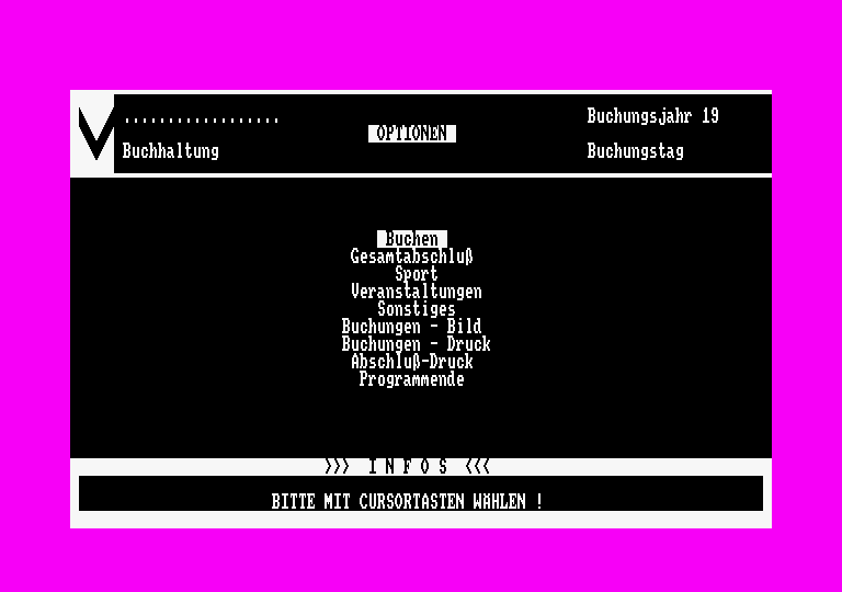 Solange das Hauptprogramm noch nicht richtig läuft, sollten die Zeilen 230 und 240 als REM-Zeilen erfaßt bleiben, um einen möglichen Totalverlust des Programmes auszuschließen und Fehler finden zu können. Das Buchungsverfahren - Über das Menü - hier Optionen genannt - gelangt man zum Buchen. Hier wird nach Buchungsjahr und Buchungstag gefragt. Am Jahresanfang, das heißt, bis März eines Jahres, fragt das Verfahren, ob eine neue Jahresrechnung beginnen soll. Wenn ja, dann werden alle Sachkonten auf 0 gestellt und der Jahresabschluß vom Vorjahr zum Jahresanfangsbestand. Man ist beim Buchen nicht an eine monatliche Verarbeitung gebunden.
