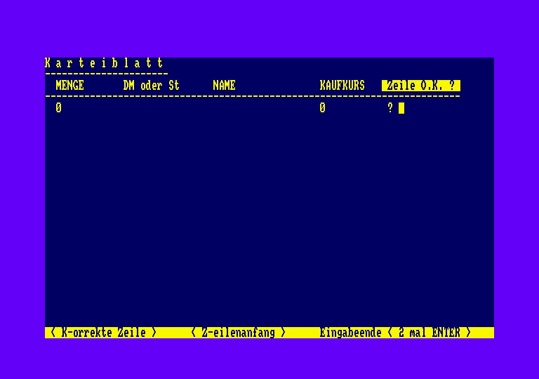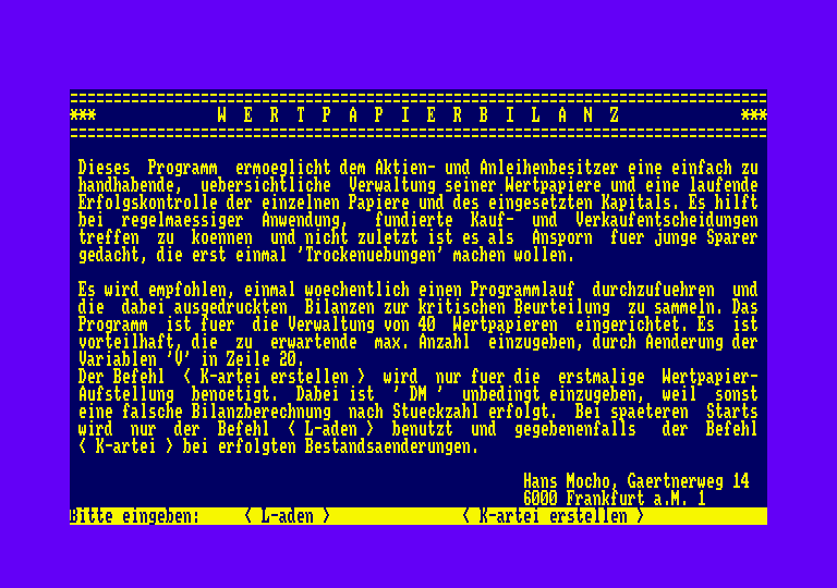 Das vorliegende Programm ermöglicht dem Aktien- und Anleihenbesitzer eine einfach zu handhabende, übersichtliche Verwaltung seiner Wertpapiere und eine laufende Erfolgskontrolle der einzelnen Papiere und des eingesetzten Kapitals. Es hilft bei regelmäßiger Anwendung, fundierte Kauf- und Verkaufentscheidungen treffen zu können und nicht zuletzt wurde dabei an den jungen Sparer gedacht, der erst einmal »Trockenübungen« machen möchte. Erstellt wurde das Programm auf dem SCHNEIDER CPC 464, mit FLOPPY DISC DD1-I und DRUCKER NLQ 401. Es läuft jedoch auch mit Kassette. Gegenüber dem Sparbuchsparer, der den Erfolg seines Sparens einmal im Jahr per Zinsgutschrift mitgeteilt bekommt, ist es für den Wertpapiersparer ungleich schwieriger, den Erfolg oder Mißerfolg seines eingesetzten Geldes zu beurteilen. Wertpapiere haben veränderliche Kurse! Käufe und Verkäufe werden mit Spesen belastet; der Bestand an Wertpapieren wird oftmals umgeschichtet; Renditen schwanken mehr oder weniger stark. Alle diese Dinge erschweren die Erfolgskontrolle. Im vorliegenden, praxiserprobten Programm wurde nun folgender Weg beschritten, um trotzdem Erfolge oder Mißerfolge in DM oder % ausdrücken zu können: Am Beginn eines Jahres z.B. wird der Wert jeder einzelnen Wertpapierposition über den aktuellen Börsenkurs ermittelt. Alle Positionen zusammengenommen ergeben den Wert des Depot's an diesem Tage. Dazu kommt ein Kassenbestand, der zu weiteren Käufen dient und der anfangs mehr oder weniger willkürlich festgelegt werden kann. Depot und Kassenbestand addiert, ergeben das eingesetzte Kapital. Von diesem Kapital ausgehend, wird nun in regelmäßigen Zeitabständen der, aufgrund der veränderlichen Börsenkurse, neue Kapitalwert ermittelt und mit dem alten Kapitalwert verglichen. Die Differenz hieraus ist der Gewinn bzw. der Verlust. Bei Verkäufen verringert sich die Anzahl der Stücke und damit der Depotwert;gleichzeitig erhöht sich der Kassenbestand. Bei Käufen erhöht sich die Anzahl der Stücke und der Kassenbestand sinkt entsprechend. Käufe und Verkäufe sind demgemäß wertneutral. Es wird empfohlen, einmal wöchentlich einen Programmlauf durchzuführen und die dabei ausgedruckten Bilanzen zu sammeln. Beim erstmaligen Start des Programms ist eine Wertpapieraufstellung anzufertigen. Der Befehl < Kartei erstellen > ist dafür zu benutzen. DM ist unbedingt einzugeben, weil sonst eine falsche Bilanzberechnung nach Stückzahl erfolgt. Bei späteren Programmstarts wird nur der Befehl < Laden > benutzt, um als erstes die DATEI zu laden. Sie enthält alle wichtigen Daten der letzten Bilanz, wie Kurse, Depot, Kasse usw. Bei zwischenzeitlich erfolgten Änderungen der einzelnen Positionen ist sodann auf < K > zu schalten und die entsprechende Korrektur durchzuführen. Es erscheint nunmehr eine Übersicht über die vorhandenen Wertpapiere mit den jeweiligen Kursen der letzten Bilanz und dem Kassenbestand. Nach Drücken von< N > wird nach Datum, Änderung des Kassenbestands durch Käufe oder Verkäufe, Spesen, Zinsen etc. gefragt. Außerdem fragt das Programm nach Dollarkurs, Durchschnittsrendite, und FAZ-Index. Diese Daten sind aus den Wirtschaftsteilen der Zeitungen zu entnehmen und wichtig für Kauf- oder Verkaufentscheidungen; ihre Eingabe ist wahlfrei. Sodann werden die aktuellen Kurse abgefragt. Aus der folgenden Wertpapierbilanz (siehe Bild 1) können alle Daten, wie Gewinne, Depotwert, Kassenstand etc. entnommen werden. Diese auf Wunsch auszudruckende Bilanz ist sehr hilfreich bei Anlageentscheidungen. Die gesammelten Exemplare, die im Format bewußt klein gehalten wurden, zeigen die Vermögensentwicklung über einen längeren Zeitraum und lassen Anlagefehler klar erkennen. Vor Abschalten des Computers werden die neu eingegebenen Daten wieder in der DÄTEI abgespeichert. Bei einem erneuten Computerlauf rücken diese neuen Daten dann in die Spalte der alten Daten usw. . Von Zeit zu Zeit empfielt sich ein Vergleich zum Jahresbeginn oder zu allen Kaufkursen. Dafür ist im Programm eine Korrekturmöglichkeit für den »Zeitraum« vorgesehen. Das Programm ist für die Verwaltung von 40 verschiedenen Wertpapieren eingerichtet. Es ist vorteilhaft, die maximal zu erwartende Anzahl (auch größer 40) einzugeben. Dies geschieht durch Änderung der Variablen »V« in Zeile 20.