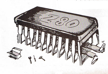 Après avoir chargé le programme (voir les explications plus loin), vous devez avoir sous les yeux un menu vertical à droite de l'écran et une petite flèche pointée vers la gauche en face de la première option du menu. Le fond et le border doivent être noirs, le menu et la flèche doivent être dans la couleur d'écriture que vous aviez choisie. Si tel n'est pas le cas, vous vous êtes planté(e)s. Pour pouvoir choisir une option du menu, il vous faut déplacer la petite flèche vers le haut avec la flèche haut du pavé curseur, ou vers le bas avec n'importe quelle autre touche sauf RETURN, ENTER, ou COPY. Lorsque la petite flèche pointe sur l'option que vous désirez, Il vous suffit de valider par RETURN, ENTER? ou COPY. Après validation, le Border devient de la couleur que vous aviez choisie pour symboliser une opération en cours et l'action a Heu. En général, sauf si c'est Indiqué dans la cescription des options qui va suivre, les touches RETURN et Enter ne servent qu'à revenir au menu. En aucun cas vous ne devez valider les paramètres qui vous sont demandés à l'aide d'une de ces touches, sauf pour les noms de fichiers, en effet la validation est automatique lorsque vous avez tapé le bon nombre de chiffres pour les adresses ou les octets. Pour chaque adresse saisie, vous devez obligatoirement taper quatre chiffres en hexadécimal (0->F), sans préfixe (&, $, #, ...), et avec les chiffres même non significatifs. Pour les octets, Il vous faut taper deux chiffres hexadécimaux. SI vous appuyez sur RETURN ou ENTER durant une saisie de chiffres, vous retournez au menu. Si vous appuyez sur RETURN ou ENTER durant une saisie de nom de fichier, ce nom de fichier est validé. Liste des options Moniteur : réalise un «dump» hexadécimal et ASCII de la mémoire à l'écran et à l'Imprimante si vous le désirez. Chaque ligne représente treize octets. Le bit 7 des codes ASCII est mis à 0. A l'écran, les codes de contrôle (<32) sont affichés mais ils sont remplacés par un point sur l'imprimante. RETURN ou ENTER ramènent au menu, n'importe quelle autre touche passe à la ligne suivante. Désassemble : désassemble la mémoire à l'écran (et à l'imprimante si vous le désirez). Les adresses sont préfixées avec un «#» comme pour l'assembleur DEVPAC de HISOFT. RETURN ou ENTER ramènent au menu, n'importe quelle autre touche passe à la ligne suivante. Poke : permet de poker des octets en mémoire. L'adresse courante, son contenu en hexa et en ASCII, sont affichés et une nouvelle valeur est demandée. Lorsqu'un octet est saisi (2 chiffres) l'opération est répétée avec l'adresse suivante. RETURN ou ENTER ramènent au menu. Fill : permet de remplir une grande zone de mémoire avec un octet constant. Le retour au menu est automatique après la fin de l'action. Attention : ne pas taper de longueur nulle. Transfère : permet de transférer une zone de mémoire à un autre endroit. L'ancienne zone n'est pas effacée, le retour au menu est automatique après la fin de l'action. Attention : ne pas taper de longueur nulle. Saisit : permet de saisir une suite d'octets qui a été saisie par l'option précédente. Lorsqu'une telle séquence est trouvée alors le message «Trouvé en #xxxx» s'affiche ou s'imprime. Lorsque le message «Rien trouvé» s'affiche, cela veut dire que la mémoire a été entièrement parcourue et que la suite d'octets que vous avez saisie, n'a plus été trouvée, A ce moment, n'importe quelle touche ramène au menu. Exécute : permet d'exécuter un programme en langage machine dont vous connaissez l'adresse. Le retour au menu s'effectuera lors de la première instruction RET rencontrée dans le niveau supérieur du programme. Visualise : permet également d'exécuter un programme en langage machine mais en y plaçant un point d'arrêt. Si celui-ci est valide, le programme est exécuté jusqu'à cette adresse, puis une sortie (écran ou imprimante) de TOUS les registres du Z80 est effectuée : le registre R est corrigé pour obtenir la bonne valeur. Après cette sortie n'importe quelle touche ramène au menu. f1 : simule l'instruction basic CAT. Sur K7, la touche ESC ramène au menu. Charge : permet de charger à partir de la K7 ou la disquette, tout fichier dont l'adresse d'Implantation est supérieure à &0FFF. Si tel n'est pas le cas, un message est affiché et le chargement n'a pas Heu. Sinon, le chargement a lieu et à la fin de celui-ci, l'adresse de départ, la longueur, et l'adresse d'entrée de ce fichier sont affichés dans la fenêtre du menu. Sur K7, la touche ESC Interrompt le chargement si vous ne voulez pas qu'il allie à son terme. Sauve : permet de sauver sur K7 ou disquette toute zone de mémoire sous la forme d'un fichier binaire dont vous devez préciser l'adresse de départ, la longueur et l'adresse d'entrée. Sur K7, ESC arrête la sauvegarde avant la fin. ATTENTION : vous ne devez pas laisser la ROM inférieure commutée lorsque vous sortez de votre programme et que vous retournez sous BZZ2ZZ80.BIN. En effet, celui-ci étant placé tout en bas de la RAM, il risquerait d'y avoir un très sérieux problème. SATANAS.BAS : c'est le programme BASIC qui charge, place en mémoire à partir de l'adresse &40, et lance, le programme proprement dit. Tapez et sauvez ce programme sous le SATANAS.DAT : c'est le programme BASIC chargé de «poker» en mémoire les lignes de DATAs formant le programme BZZZZZ80.BIN, qui lui est programmé à 100% en assembleur, et de le sauver sur la K7 ou la disquette après vous avoir proposé quelques petites modifications selon vos préférences : choix de l'ordinateur que vous possédez, choix de la couleur d'écriture et de la couleur du border représentant une option en cours que vous désirerez lors de l'exécution de BZZZZZ80.BIN. La couleur du fond, ainsi que la couleur du border symbolisant l'accès au menu, seront de toutes façons noires. Une fois ces choix faits et le programme BZZZZZ80.BIN s