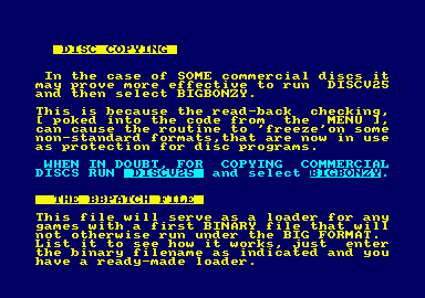 When you want to edit the data on the disk, Bonzo Doo Dah again provides you with a safety net. You can select the track you want to edit, and the program remembers as much of that track as you want to change. This means that you can quickly restore a track to its original state. It's a good feature, but if you find you have made a mistake after you have switched to another track, that's too bad. because the program remembers only one track at a time. The moral: be careful despite the safety net. Search warrant The last editing option is to search the disk. You type in the string you want to search for - up to 128 bytes long, in Ascii or Hex. If the machine finds that particular sequence on the disk, it gives you the option of going to it under the Track and Sector editor, or to ignore it and search on. You can also jump to Bigbonzy or to the copying routine. Bonzcopy is a copying program, rather like Filecopy on CPM 2.2. From a list of files you select the ones you want to copy, up to ten at one time. It can handle the maximum standard size of file under Amsdos. It will copy programs onto the Bigbonzo format. On the rear of the disk is an example of a Bigbonzo-format disk, including some very pretty pictures and a free adventure game. Some of the wit in the graphics is pretty sharp I especially liked the Amiga lookalike! (Hasn't someone done that before?) Alluding to earlier Nemesis titles, these are labelled "Meddler diversions", and needless to say, they are. The program's presentation is flawed only by the manual: one piece of paper typed on both sides. It contains everything relevant to the program, and if you know what you are about I doubt if you'll look at it much. Most of the program is self-explanatory - to the informed. If you want to explore deeper into disk software, you will need a good piece of kit to help you. As commercial disk editors go, this is the best I've seen in a long while. It can't do everything, and will no doubt be superseded someday, but for its user-friendly approach, its sensible price, and its humour, I recommend it.