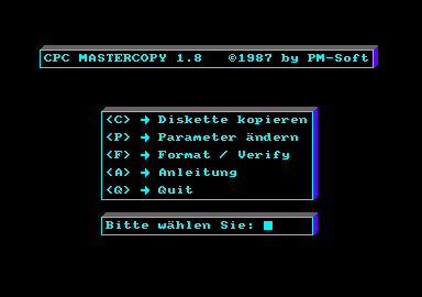 ”CPC Mastercopy 1.8" nennt sich ein neues Kopierprogramm für alle CPC-Rechner. Es erlaubt die Anlage einer Sicherheitskopie von Diskette auf Diskette. Dabei kann es bis Spur 43 kopieren, was sich über ein Parameter-Menü einstellen läßt. Wir haben "Mastercopy” mit einigen der neuesten Programme ausprobiert; das Ergebnis war positiv. Man kann also davon ausgehen, daß es den größten Teil der Software bewältigt. Darüber hinaus bietet der Hersteller einen besonderen Service an. Programme, die sich nicht kopieren lassen, sollen mit der Original-" Mastercopy ”-Diskette eingeschickt werden. Der Anwender erhält dann eine neue Version, mit der er auch das Programm kopieren kann, das zuvor Schwierigkeiten bereitete. "Mastercopy" kostet 69.90 DM. Eine Version für den Joyce ist in Vorbereitung. Von "Mastercopy" selbst läßt sich übrigens keine Sicherheitskopie anfertigen.
