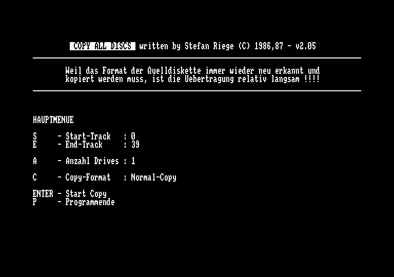 Aus Eins mach Zwei Stellen Sie sich mal folgende Situation vor: Sie sitzen an einem warmen Sommerabend vor Ihrem Computer und brauchen dringend noch einige Daten aus Ihrem Dateiprogramm. Nebenbei fallt Ihnen auf, daß auf der Datendiskette kein Platz mehr ist, eine neue muß her, und die möchte bitteschön auch noch vorher formatiert werden. Gesagt, getan, die Diskette mit dem Formatierprogramm wird ins Laufwerk geschoben, und die Formatierroutine gestartet. Wie schon gesagt, der Abend ist schön und warm, die Gedanken sind beim nächsten Grillfest und die Formatierdiskette wird formatiert. Das Ergebnis ist klar: Diskette und gute Laune sind kaputt. Was also muß her? Ein gutes Kopierprogramm. Sicherheitskopien von den wichtigsten Disketten sind so nötig, wie eine Tastatur beim Computer. Sehr schnell ist es passiert, daß ein Programm, das für die Arbeit mit dem Computer fast unentbehrlich geworden ist, durch irgendeinen widrigen Umstand nicht mehr zur Verfügung steht, sei es durch einen Fehler des Benutzers, oder durch mechanische Fehler. Erst wenn so etwas passiert, weiß man ein gutes Kopierprogramm, sowie die angefertigten Sicherheitskopien zu schätzen. Bei der Entwicklung dieses Kopierprogrammes wurde besonders auf Vielseitigkeit und Bedienungsfreundlichkeit Wert gelegt. Nachdem man das Programm mit RUN“COPYALL“ gestartet hat, wird das Programm und der Maschinenspracheteil geladen. Gleich darauf erscheint Das Hauptmenü Hier kann man die Tracknummer ändern, wo das Kopieren begonnen bzw. beendet werden soll. So ist es beispielsweise möglich, auch die Tracks 40-43 zu kopieren. Des weiteren ist es möglich, die Anzahl der vorhandenen Laufwerke einzugeben. Es kann mit einem oder zwei Laufwerken gearbeitet werden. Arbeitet man mit zwei Laufwerken, muß sich die Source-Diskette (also die Diskette, die kopiert werden soll) im Drive A und die Destination-Disk (die Zieldiskette) in Drive B befinden. Das Kopieren mit zwei Laufwerken ist bei diesem Programm eine enorme Arbeitserleichterung. Mit dem Menüpunkt 'P' kann man das Programm verlassen und ENTER läßt der Kopiervorgang beginnen. Es gibt aber noch einen weiteren Menüpunkt, den des Copy-Formats. Der Kopiervorgang Startet man nun den Kopiervorgang mit ENTER, wird man aufgefordert, bei zwei Laufwerken die Disketten einzulegen oder, bei einem Laufwerk, die Diskette entsprechend zu wechseln. Es empfiehlt sich, die Original-Diskette mit einem Schreibschutz zu versehen, so daß während des Kopierens bei einem Verwechseln der Disketten kein Schaden entsteht. Im Folgenden wird ein grober Ablaufvorgang des Kopierens geschildert: Erst wird das Format der ersten sechs Tracks erkannt (es werden auch die Disketten kopiert, die man mit DISCCOPY der CP/M-Diskette nicht kopieren kann, weil das Programm illegale Tracks erkennt!) und diese werden dann, falls formatiert, eingelesen. Dann erfolgt ein Disketten- bzw. Laufwerkswech-sel, die zweite Diskette wird formatiert und, falls nötig, beschrieben. Wird man aufgefordert, die Diskette(n) einzulegen, sollte man nach dem Einlegen für einen kurzen Moment warten, da sonst Amsdos die Disketten noch nicht registriert hat. Der Programmteil, der für das Erkennen des Formates verantwortlich ist, ist sehr empfindlich und wird dann den ersten Track für nicht formatiert erklären, so daß die Kopie unvollständig ist. Zum Programm COPY ALL DISKS besteht aus zwei Teilen, einem BASIC-Hauptteil (Listing 1) und einem BASIC-Lader (Listing 2), der nach dem Start das benötigte Binär-File COPYALL.BIN herstellt. Der BASIC-Lader sollte vor dem ersten Start auf Diskette gesichert werden, andernfalls bekommen Ihre Finger Überstunden auferlegt. Ach ja, eines noch. COPY ALL DISK heißt nicht unbedingt, daß jede Diskette kopiert wird. Der Kopierschutz kommerzieller Programme wird von COPY ALL DISK nicht bewältigt. Für Ihre Arbeitsdiskcttcn und sonstige Kopien mich! da«* Pnv-gramm jedoch allemal aus.