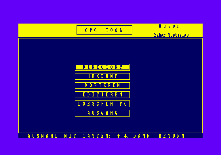 FILE TRANSFER -Datentransport... unter anderem Die Eingabe eines BASIC-Programmes beansprucht gewöhnlich viel Zeit, besonders wenn es sich um ein Programm handelt, das noch in der Entwicklungsphase steckt. Noch mehr Zeit wird in Anspruch genommen, wenn man den zugehörigen Text mit einer Text Verarbeitung oder Daten in eine Datenbank eingibt. Falls man dies auf einem PC-Rechner am Arbeitsplatz macht, stellen oft die Arbeitszeit und die Inanspruchnahme des Rechners den “Engpass“ dar, so daß es sehr günstig wäre, einen Teil dieser Arbeiten zuhause erledigen zu können und daß der Rechner am Arbeitsplatz nur für die Verarbeitung oder Anwendung dieser Files benutzt wird. Für diejenigen, die glücklicherweise auch einen der PC- Rechner ihr Eigen nennen, gibt es da keine Schwierigkeit. Man kann aber mit den geeigneten Programmen auch den CPC 6128 für diesen Zweck benutzen. Die Voraussetzung dafür ist die Möglichkeit, daß der Rechner das PC-(IBM-)Format erkennt und daß man über ein zusätzliches 5.25“-Laufwerk verfugt. Diese Laufwerke sind seit geraumer Zeit immer öfter bei CPC-Besitzem anzutreffen, da die Preise dieser Laufwerke ziemlich heruntergesetzt (unter 400,— DM) wurden. Das Programm, das hier präsentiert wird, gibt diese Möglichkeit des File-Austausches zwischen den Schneider CPC 6128-Rechnern oder PCW 8256/8256 (JOYCE) und IBM- kompatiblen Rechnern. Dabei wird die vollständige Kompatibilität nur bei den ASCII-Dateien erreicht, BASIC-Programme können also nur dann übertragen werden, wenn sie mit der Option “A“ (auch im ASCII-Code) gespeichert worden sind. Dies bedeutet, daß diese Programme an einem Rechner eingelesen und an einem anderen getestet und gestartet werden können. Das Programm wurde größtenteils in BASIC programmiert, bis auf einen kleinen Maschinenspracheteil, der zur Kontrolle des Laufwerkes benötigt wird. Alle Optionen in den benutzerorientierten Menüs können hauptsächlich über die Cursortasten, die Copy- und die Return-Taste aufgerufen werden. Das Hauptmenü setzt sich aus folgenden Menüpunkten zusammen: