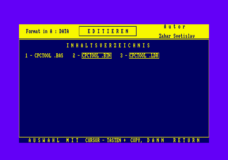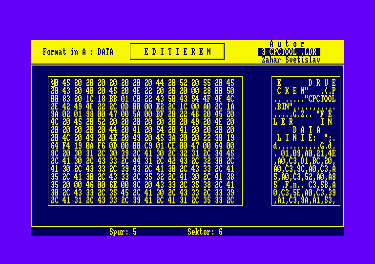 3.- COPY CPC - JOYCE - PC Dieser Programmteil ist wohl der interessanteste, wie auch schon am Anfang erwähnt, denn er ermöglicht das Dateikopieren von einer Diskette auf die andere, ohne Rücksicht auf das Format. Hierbei sei allerdings gesagt, ohne näher auf Erklärungen zur Formatstruktur ein-gehen zu wollen, daß man mit dem Programm die Arbeit vom PC nur simuliert; alle Angaben, die für die Erkennung der Datei seitens des IBM PC- oder eines kompatiblen Rechners nötig sind, werden in die entsprechenden Sektoren eingetragen (es genügt also nicht, nur den Dateinamen ins Directory einzutragen). Wie schon erwähnt, kann man neben der Übertragung von ASCII-Dateien auch im ASCII-Code vorher gespeicherte BASIC-Programme übertragen. Es wäre natürlich auch möglich, ein besonderes Programm zu erstellen, welches ein in einer BASIC-Version geschriebenes Programm in ein anderes transformieren könnte, wobei wir uns allerdings auf die Befehle, die in beiden Versionen vorhanden sind, beschränken müßten. Aber das ist ein anderes Thema. 4.- EDITIEREN Nicht weniger nützlich (für die meisten vielleicht noch nützlicher) ist die Möglichkeit, auf die Inhalte der Sektoren einer Diskette zum Zweck der Überprüfung und Änderung zurückzugreifen, ganz egal, ob es sich um CPC-, JOYCE-oder PC- Disketten handelt. Wenn dieser Programmteil angesprochen wird, fordert das Programm, daß man die Diskette bestimmt und danach auch die Dateien und Sektoren, die kontrolliert werden sollen. Danach wird der Inhalt der ersten Hälfte des ausgewählten Sektors auf dem Bildschirm in zwei unabhängige Fenster ausgegeben: links hexadezimale Codes, rechts ASCII-Codes. Der Cursor läßt sich in alle vier Richtungen, links, rechts, aufwärts, abwärts, mit den Cursortasten bewegen. Mit dem gleichzeitigen Drücken der SHIFT-Taste und einer der Cursortasten bewegt sich der Cursor zum Anfang oder zum Ende der Zeile oder des Fensters, und mit dem Drücken der CTRL-Taste und der Cursor-rechts- oder Cursor-links-Taste bewegt man sich von einem Fenster zum anderen. Um die andere Hälfte des Sektors einzulesen, drücken Sie die Cursor-auf- oder Cursor l/2Taste zusammen mit der CTRL-Taste. Mit RETURN wird der EDIT-Modus verlassen und das Programm fragt, ob man diesen veränderten Sektor auf Diskette speichern will (natürlich an derselben Stelle, wo er vorher war) um danach den nächsten ausgewählten Sektor der gleichen oder nächsten Datei einzulesen. 5.- LÖSCHEN DER PC-DISKETTE Dieser Programmteil wird benutzt, wenn man den Inhalt der PC-Diskette löschen will. Man kann den auf dem Originalrechner eingegebenen Inhalt löschen, oder auch vorher auf dem CPC-Rechner erstellte und von dort kopierte Dateien. Falls keine Diskette vom IBM-Format in Laufwerk B vorhanden ist, meldet das Programm, daß es sich um ein unkorrektes Format handelt.