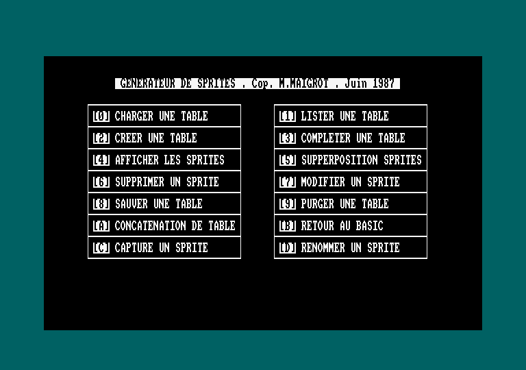 Une fois les conditions ci-dessus satisfaites, la liste des sprites est affichée (et peut être imprimée) et suivie d'une information complète sur la structure de la table. Vous pouvez ensuite la sauvegarder sur disquette. Cette table peut être rechargée et retravaillée par le générateur de sprites mais les noms des sprites sont définitivement perdus. Préciser qu'il s'agit d'une table "travail" au moment du chargement. CONCATENATION DE TABLE Un terme bien barbare pour dire qu'une table s'ajoute à une autre. Vous pouvez additionner autant de tables que la place mémoire le permet. Attention, si vous dépassez les limites, un plantage est possible. Cette option sauvegarde la table en mémoire sous forme de fichiers provisoires. Ensuite l'option de chargement est présentée. La table donnée sera alors ajoutée après affichage de la liste et confirmation. Si l'option n'est pas confirmée la table d'origine est restaurée et le programme revient au menu. RETOUR AU BASIC Ça peut toujours servir. Le code reste er mémoire et peut être rappelé à toui moment. Attention, l'état clavier (speec key & répétition est réinitialisé). CAPTURE SPRITE Cette option vous permet de prélevei une zone exploitable par générateur de sprites dans une image écran quelcon Un cadre apparaît vers le milieu de l'écran. Il est calibré à la taille maximum admise par la grille du générateur. Les flèches du curseur le déplacent, SHIFT + flèches curseur varient les dimensions de la zone de capture. ENTER vous propose les options de capture, il est possible de nommer le sprite. CTRL + R = retour au menu principal à tout moment. RENOMMER UN SPRITE Permet de changer le nom d'un sprite ou de renommer les sprites d'une table travail. L'EDITEUR Les options, créer table, compléter table et modifier sprite permettent l'accès du mode édition. Vous devrez d'abord préciser :