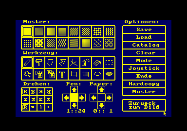 Ohne Joystick läuft nichts Nach dem Titelbild von Happy-Painter erscheint das Hauptmenü (siehe Bild. Seite 60), das die einzelnen Funktionen sehr übersichtlich anzeigt. Happy-Painter wird komplett über Joystick gesteuert. Wünschen Sie eine bestimmte Funktion, so müssen Sie den kleinen Pfeil (Zeiger) mit dem entsprechenden Feld zur Deckung bnngen. Die Funktion wird ausgewählt (angeklickt), indem der Feuerknopf des Joysticks betätigt wird. Nur Dateinamen und Bildtexte müssen Sie über die Tastatur eingeben. Das rechte Fenster des Menüs ist für grundlegende Operationen wie Dateiverwaltung und Grundeinstellungen von Arbeitswerten (Modus 0 oder 1. Joystickgeschwindigkeit etc.), zuständig. Außerdem können Sie mit der Funktion »Hardcopy« Bilder auf den Drucker NLQ 401 von Schneider übertragen. Die Hardcopy-Routine wurde aus der Happy-Computer-Ausgabe 6/86 übernommen und kann durch vier Steuerzeichen an andere Drucker angepaßt werden. Mit »Muster« wird ein Untermenü aufgerufen, das die Konstruktion von Mustern nach eigenem Geschmack erlaubt. Diese Muster sind zum Füllen von Flächen und Bildteilen geeignet. Das linke obere Fenster zeigt an. welche Muster gegenwärtig zur Verfügung stehen. Das momentan eingestellte Muster ist durch einen hellen Rand gekennzeichnet. Darunter befindet sich die Werkzeugbox. die alle verfügbaren Funktionen zum direkten Bearbeiten eines Bildes aufllstet. Jede Funktion wird durch ein geschickt gewähltes Symbol repräsentiert, so daß nach kurzer Eingewöhnungszeit die Bedeutung aller Symbole klar ist. Die eingestellte Funktion ist wieder durch einen hellen Rand gekennzeichnet. In der linken unteren Ecke des Menüs befindet sich ein Fenster, das für Drehungen, Spiegelungen und Verkleinerungen zuständig ist. Anhand des Buchstabens R werden die Bildmanipulationen angezeigt und durch Anklicken ausgewählt. In den acht oberen Feldern sucht man die Art der Drehung und Spiegelung aus, die unteren vier Felder zeigen die Formen der Verkleinerung an. Rechts daneben liegen die beiden Farbkreuze für Vordergrundfarbe (PEN) und Hintergrundfarbe (PAPER). Die Nummer des Farbregisters (erster INK-Wert) wird horizontal und der Farbinhalt (zweiter INK-Wert) vertikal eingestellt. Farbregistemummer und Nummer des Farbinhaltes zeigt die Fußzeile an. Mannigfaltiges Menü Die Save-Funktion erlaubt das Speichern eines Bildschirminhalts mit kurzem Zusatztext auf Kassette oder Diskette Für das Aufzeichnungsformat steht ein Standardformat und ein speicherplatzsparendes, komprimiertes Format zur Verfügung. Bei Wahl des Standardformats speichert das Programm die Daten mit der Extension PIC, sonst mit der Extension MAL. Direkt vor dem Speichern können Sie noch einen kurzen Begleittext eingeben. Die Load-Funktion liest die gespeicherten Bilder wieder ein. Hier müssen Sie unbedingt die Extension mit angeben. Die Muster-Funktion ruft ein Untermenü auf, in dem ein neues Muster definiert werden kann. In einem Feld, dessen Größe dem Viertel eines Musters vom Musterblocks entspricht, können Sie einzelne Pixel durch Anklicken setzen und zurücksetzen, »fertig« installiert das neue Muster im Musterblock und »quit« beendet das Untermenü. Über das Feld »Zurück zum Bild« wird die Zeichenfläche aufgerufen. Diese enthält am unteren Rand eine Menüleiste, in der Sie die Muster, Funktionen, sowie Vorder- und Hintergrundfarbe einstellen können, ohne das Hauptmenü aufrufen zu müssen. Über Anklicken des Feldes mit dem nach links weisenden Pfeil blättert man zurück und über das Feld mit dem nach rechts weisenden Pfeil vorwärts. In dem Feld mit der Vordergrundfarbe können Sie zusätzlich die Strichstärke (breit oder schmal) wählen. Die Strichstärke wird von allen Strichfunktionen und von der Sprühfunktion berücksichtigt. Die Werkzeuge von Happy-Painter Insgesamt sind für den Anwender 16 verschiedene Funktionen zur Bildbearbeitung verfügbar.