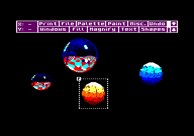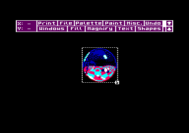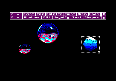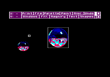 FERMER LA FENETRE Window, ah ! que cette option elle est bien ! Même que je m'en sers régulièrement, tout le temps que je dessine. Grince à ce menu, il vous sera possible de faire subir à votre dessin tout un tas de choses qui sont bonnes pour lui ; comme, par exemple, rétrécissement, rotation, découpage d'une portion ou de l'intégralité de l'image, etc. Mais revenons plutôt à ce menu qui. une lois activé, surprend par sa complexité au niveau des options disponibles (n'ayez pas peur, il y en a plein beaucoup mais très facilement utilisables pour des experts tels que vous) (ND Septh : Dis donc. Lolo. faudrait peut-être que t' apprène à parler). Hautqu'est, je vais essayer Septh (tuagénaire). A nos moutons à présent. En haut, se trouve tout d'abord Set Inks qui vous est très familier, donc pas la peine d'en parler. Puis vient ensuite Define Window. qui. comme son nom l'indique, permet de créer une fenêtre visant à capturer une partie ou la totalité de votre dessin (pour la totalité d'une image il vaudra mieux utiliser Whole Window car cette fonction le fait automatiquement) pour pouvoir lui faire subir diverses transformations. Last Window rappelle la dernière fenêtre qui a été créée, tandis que Clear Window efface ce qui se trouve à l'intérieur de la fenêtre définie. Au lieu de dormir, Poum, tu ferais mieux d'écouter ce qui va suivre. Paste Mode, ou plutôt ses options telles que Xor, And et Or rappellent étrangement ces mêmes fonctions basiques (voir Joe Lascience), tandis que Smear aura pour effet de créer un auto-repeat sur votre bouton de sélection (joystick ou espace) ; te qui vous pci mettra de faire de jolies effets spéciaux avec vos fenêtres préalablement fabriquées. Il vous sera possible également déjouer avec les couleurs (ND Poum : en tait, on joue pas avec les couleurs, il est fou, lui), mais nous verrons ceci eu détail un peu plus loin (voir Exclude Inks). PASTE MOI LES CISEAUX Ce sont à présent les fonctions de travail sur les fenêtres que nous allons décortiquer. Examinons tout d'abord Cut & Paste Window qui permet de couper une partie ou l'intégralité d'une image puis de la réafficha où bon vous semble. Cut, clear & Paste réalisera le même travail, mais effacera en plus votre dessin de départ. Donc, attention ( de canne à pêche, oui je sais elle est vraiment très nulle). Viendra ensuite Re-Scale Window qui permettra de capturer une image pour pouvoir la rétrécir ou la grossir et l'afficher ultérieurement. Clear & Re-Scale opérera de façon identique mais en effarant la fenêtre de départ Donc, attention ( non, c'est fini, j arrête). Il vous sera possible à tout moment de charger ou de sauver votre Window (la sauvegarde fontionnera si une Window a été définie) sur disquette grâce à l'option File, Vous voudriez afficher des fenêtres autant de fois que vous désirez ? C'est possible grâce à l'option Multiple (celle-ci sert essentiellement pour les fondions Cut & Paste Window. Cut, Cut & Paste, Re-Scale Window et enfin Clear & Re-Scale). Allez les amis, encore un dernier effort de concentration ; après, on dessine, c'est promis juré (mais je crache rais pas par terre car j'veux pas salir nos nouveaux locaux). La dernière option disponible (More) est en fait un mini menu général. Sous celui-ci, vous aurez la possibilité de faire subir à vos fenêtres un symétrie verticale ou horizontale ou les deux à la fois (voir Flip Vertical et Flip Horizontal ) . Les rotations seront d'utilisation déconcertante après, avoir choisi Rotate ¼ , ½ ou 3/4. Quoi ? Vous n'aime pas les couleurs du damier ? Hh bien, changez-les donc. Mais si-mais si , c'est possible grâce aux options ( Chauge Inks ou Swap Inks. Pour ces dernières, nous verrons leur fonclionnement dans la partie dessin. UN DESSIN SINON RIEN Reprenons, si vous le voulez bien, le dessin du mois précédent. Pour ceux qui viennent de débarquer pour la première Ibis dans cet article (ND Moi : la honte sur vous !) , je leur conseillerais de rattraper le retard (allez. au boulot). Nous allons ensemble manipuler les fonctions de Window. Pour commencer nous définirons une fenêtre autour de la boule avec Define Window. Après avoir cliqué sur cette option, vous verrez apparaître, sur votre écran, un curseur en forme de carré. Amenez-le près de votre bouboule. cliquez, puis déplacez-vous pour entourer 1 objet de vos fantasmes.