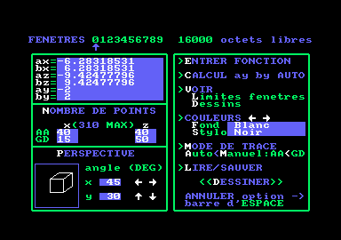 — Pour le CPC 464 sélection automatique du lecteur de disquette si celui-ci est branché, vitesses d'écriture 1000/2000 ou 3600 bauds, possibilité de sauvegarde par blocks de 2K ou en un seul block de l'image créée ; — Possibilité de définir sur l'écran jusqu'à 10 fenêtres (donc on peut avoir sur l'écran plusieurs courbes différentes) ; — Possibilité de compiler et décompiler les images écran ce qui permet de gagner de la place sur la disquette (ou de réduire le temps de chargement) ; — Possibilité d'intégrer les courbes créées dans un programme personnel ; — Facilité d'introduction et de contrôle des paramètres du tracé ; — Pas de contrôle et traitement des erreurs ("overflow" et "division by zéro" en particulier). N.B. : si un "BREAK" est produit (par le système ou l'utilisateur) il suffit de presser la petite touche ENTER du pavé numérique pour retourner au menu (les dessins mémorisés sont conservés). Toutefois, si on utilise cette méthode pour repartir un peu trop souvent, le système finira par afficher "memory full". Le plus simple dans ce cas est d'entrer une ligne du type 35' pour effacer les adresses de retour des appels par "GOSUB". On peut ensuite repartir avec la touche ENTER du pavé numérique. CONCLUSION Ce programme est destiné : — à permettre la réalisation de pages écran de présentation ; — à l'étude de fonctions du type y =f(x,z). MODE D'EMPLOI Principe du menu : l'accès aux différentes options se fait par la pression d'une ou deux touches qui correspondent à des lettres de commandes. Ces lettres de commande apparaissent en blanc sur fond noir. Il est possible, si on le désire, de faire apparaître ces lettres de commande en vidéo inverse en modifiant la ligne 30 : remplacer 30 l$ = "" par 30 l$ = CHR$(24). Pour annuler une option sélectionnée par erreur presser la barre d'espace ou presser ENTER sans rien entrer pour une réponse à un "INPUT".