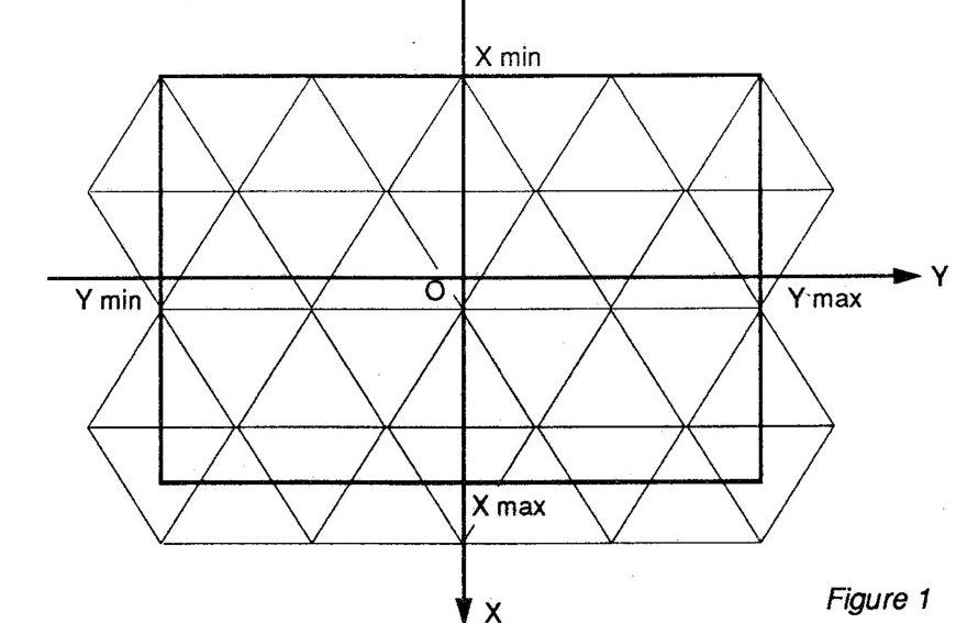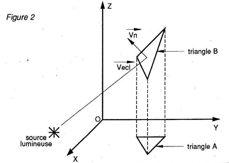 RELIEFS MATHEMATIQUES est un programme graphique permettant de créer des images de surfaces générées à partir de fonctions mathématiques du type z =f(x,y). En fait, "RELIEFS MATHEMATIQUES" ambitionne de visualiser lesdites surfaces selon l'aspect qu'elles auraient si on les matérialisait. Cela implique que leur représentation tienne compte de la réalité de la perspective (le programme crée un effet de perspective à trois points de fuite) mais également de la quantité de lumière que chaque élément de la surface renvoie à l'œil de l'observateur (selon leur position par rapport à la source lumineuse qui les éclaire, ces éléments sont plus ou moins clairs, d'où l'effet de relief). De plus, "RELIEFS MATHEMATIQUES" offre la possibilité de visualiser les fonctions à tracer sous n'importe quel angle.PRINCIPE DE FONCTIONNEMENT Une fois entrés les données et paramètres qu'on lui a fournis (nous les verrons plus loin) le programme commence par découper le domaine d'étude en triangles équilatéraux ; il s'arrange en tout cas pour qu'un pavage de triangles équilatéraux recouvre la totalité de ce domaine (fig. 1). Les sommets de ces triangles ont chacun une abscisse X et une ordonnée Y à partir desquelles sont calculées les coordonnées Z d'altitude (fig. 2). Cette troisième coordonnée, pour chacun des sommets, permet de définir un nouveau triangle B dont les sommets appartiennent à la surface à tracer. Le triangle B est en fait la projection approximative du triangle A sur la surface (voir schéma précédent) dont nous considérons qu'il constitue une facette. On définit alors un vecteur Vn orthogonal au plan du triangle B et dirigé dans le sens des Z croissants et un vecteur Vecl reliant la source lumineuse éclairant la surface au centre de la facette. En fonction de l'angle que forment ces deux vecteurs, le programme détermine quelle couleur il devra affecter à cette facette, sachant que plus Pangle est grand, plus cette couleur est claire. Les facettes sont ensuite affichées à P écran en partant de celles qui sont le plus éloignées de Pobservateur vers celles qui sont les plus proches ; c'est l'algorithme du peintre.