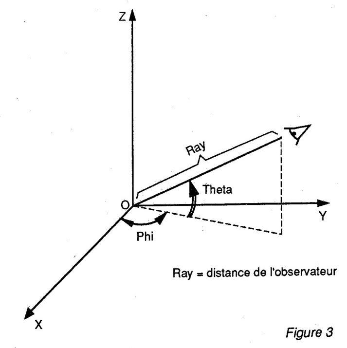 - Angles de vision vertical et horizontal, distance de Pobservateur : ces paramètres correspondent aux coordonnées sphériques de la position de l'observateur (fig. 3).