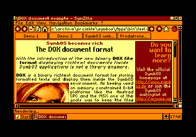 SymZilla est un browser pour SymbOS , plus exactememnt il ne permet pour le moment que de lire des fichiers HTML, c'est déjà un bon début . Attention SymZilla nécessite 192ko de mémoire , hors extension de mémoire sur votre CPC point de salut.