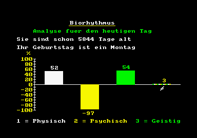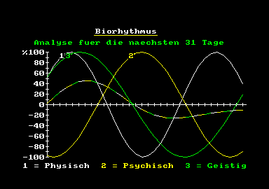 In der heutigen Zeit, in der Gesundheit und Wohlbefinden so groß geschrieben werden, wie schon lange nicht mehr, werden Biorhythmus-Programme für alle Rechnertypen angeboten, mit den unterschiedlichsten Optionen und mit einer Menge Speicher verbrauch. Das dies auch anders geht, zeigt unser kleines Biorhythmus-Programm von 4 KByte Länge.
