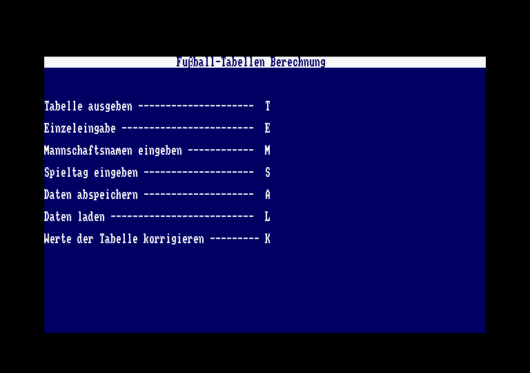 Bei diesem Programm dreht es sich um die Berechnung der Tabelle der 1. Fußballbundesliga während oder nach dem Spieltag. Die Tabellenberechnung Bei jedem Spiel werden 2 Plus- und 2 Minuspunkte vergeben. Der Gewinner des Spiels erhält 2 Pluspunkte, der Verlierer 2 Minuspunkte. Bei einem Unentschieden teilen sich die Mannschaften die Punkte: jede erhält einen Plus- und einen Minuspunkt. Für den Tabellenplatz ist in erster Linie das Punktekonto entscheidend. Je mehr Pluspunkte eine Mannschaft hat, um so mehr Siege kann sie verzeichnen und um so höher steigt sie in der Tabelle. Haben zwei Mannschaften den gleichen Punkte-stand(Plus- und Minuspunkte der beiden Mannschaften sind gleich), so ist für den Tabellenplatz die Tordifferenz entscheidend, Die Tordifferenz wird gebildet aus der Summe der geschossenen Tore und der Summe der bekommenen Tore einer Mannschaft. Die Mannschaft mit der höheren Tordifferenz belegt dann den vorderen Platz. Sind Punktekonto und Tordifferenz von zwei Mannschaften gleich, so belegt die Mannschaft den vorderen Tabellenplatz, die mehr Tore geschossen hat. Außerdem führt das Programm eine Bilanz, die aufzeigt, wie sich die Punkte aufteilen. Aus der Bilanz läßt sich auch der Punktestand der jeweiligen Mannschaft folgendermaßen berechnen: Pluspunkte = 2 * Siege + 1 * Unentschieden Das Programm .. .läßt sich in drei Teile gliedern: In den Anfang, in dem Variablen definiert, Farben eingestellt und Zeichen definiert werden, in das Hauptmenü, von wo aus die 7 verschiedenen Optionen Hinweis: Wer das Programm ein zweites Mal durch »Run« starten möchte wird Pech haben, denn der Computer protestiert gegen das SYMBOL AFTER in der Zeile 20. Dies liegt an den Zeilen 240-260 die die Ausgabe von Daten auf Cassette beschleunigen. Besitzer von Diskettenlaufwerken können sich diese Zeilen sparen. Wer das Programm also ein zweites Mal starten will, sollte »RUN 20« oder »GOTO 500« eingeben, wobei bei dem GOTO sämtliche Daten erhalten bleiben. Die 7 Optionen Mannschaftsnamen eingeben: jede Mannschaft besitzt eine Nummer, damit beim Abfragen der Spielpaarungen nicht so viel eingegeben werden muß. Jeder Nummer kann nun ein Name zugeordnet werden, der dann auch in der Tabelle auftaucht. Die Namen können jederzeit verändert werden. Dies hat keinen Einfluß auf das Programm. Beim Eingeben der Mannschaftsnamen ist folgende Form einzuhalten: Nummer < : > Name < ENTER > Durch < ENTER > kommt man ins Menue zurück. Spieltag eingeben: Als erstes werden die Spielpaarungen (Begegnungen) abgefragt. Es werden die Mannschaftsnummern erwartet (nicht die Namen!!), die durch den Doppelpunkt getrennt werden. Zur Kontrolle werden nach jeder Eingabe die bisher eingegebenen Begegnungen angezeigt. Danach werden die Ergebnisse eingegeben. Diese können anschließend verändert oder gelöscht werden. Auch die Ergebnisse müssen durch den Doppelpunkt getrennt werden. Danach wird die Tabelle berechnet. Die Einzeleingabe: ist ähnlich aufgebaut wie die Option »Spieltag eingeben«. Auch hier geht es um das Eingeben von Ergebnissen. Man muß jedoch nicht alle Ergebnisse eingeben, sondern kann zwischendurch die Tabelle berechnen, sie ausdrucken, sowie die bisherigen Eingaben abspeichern. Daten Laden / Abspeichern: Beim Abspeichern werden die Daten der Tabelle, sowie der momentane Stand der Einzeleingabe abgespeichert. Anhand des Punktekontos der Mannschaft Nr. 1 wird der Spieltag ermittelt. Daraus ergibt sich der Dateiname: » < Spieltag >. SPT«. Beim Laden wird nach dem Spieltag gefragt, damit die richtige Datei geladen wird. Dabei ist am 18. Spieltag eine 17 einzugeben, da der 17. Spieltag der zuletzt gespeicherte sein muß. Tabelle ausgeben: Die Tabelle kann auf dem Bildschirm und auf dem Drucker ausgegeben werden. Es werden Platz, Name, Punkte, Tore, Tordifferenz und Bilanz jeder Mannschaft ausgedruckt. Werte der Tabelle korrigieren: Hier können die Zahlenwerte der Tabelle verändert bzw. neu eingegeben werden. Punkte und Tore sind wie üblich durch den Doppelpunkt, die Werte der Bilanz jedoch durch das Komma zu trennen. Wer das Programm nach eigenen Vorstellungen erweitern oder verändern will kann das gerne tun. Er kann dabei auf einige Unterprogramme zurückgreifen, die ihm das Leben leichter machen: 3700 Ja-Nein-Abfrage Die Tasten < J > und < N > werden solange abgefragt, bis eine von ihnen gedrückt wird. Die Variable jn erhält dann den Wert 0 für »Ja« und den Wert 1 für »Nein«. 4000 Windows definieren Der Bildschirm wird in 3 Windows eingeteilt: # 2 ist die erste Zeile (für eine Überschrift) # 1 sind die Zeilen 2—11 (zum Ausdrucken von Ergebnissen, Mannschaftsnamen o.ä.) #0 sind die Zeilen 12—25 4100 String zerpflücken Nach Aufruf des Unterprogrammes erwarten der Computer einen String, der anschließend in den Teil vor und in den Teil nach dem ersten Doppelpunkt geteilt wird. Ist bei Einsprung die Variable se < > 0, so läßt er auch Strings als Eingabe zu, die er als b$ und d$ zurückgibt. Anderenfalls akzeptiert er nur Zahlen, die er als e% und z% zurückgibt. Das Hauptmenue kann durch beliebig viele neue Optionen erweitert werden. Variablenliste Dimensionierte Variablen: Name$ Name einer Mannschaft ppu Pluspunkte einer M. mpu Minuspunkte einer M. gto Geschossene Tore einer Mannschaft bto Bekommene Tore einer M. bs Anzahl der Siege einer Mannschaft (für die Bilanz) bu Anz. der Unentschieden einer Mannschaft bn Anz. der Niederlagen einer Mannschaft platz Nummer einer Mannschaft die einen bestimmten Tabellenplatz belegt. platz(1) enthält z.B. die Nummer der Mannsch. die den ersten Platz in der Tabelle belegt, epu Bezieht sich auf die Einzeleingabe, epu(1) ist 1, wenn für die Mannschaft Nr. 1 ein Ergebnis eingegeben wurde, kon Hängt mit der Eingabe der Spielpaarungen zusammen. kon (1) enthält die Nummer der Mannschaft die im ersten Spiel als erste eingegeben wurde, kon (2) diejenige, die als zweite eingegeben wurde tg+tb enthalten die Ergebnisse der Spiele, tg