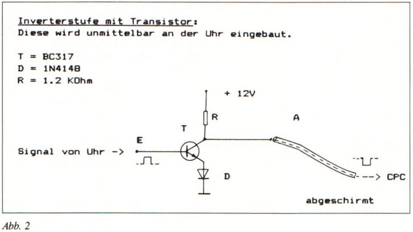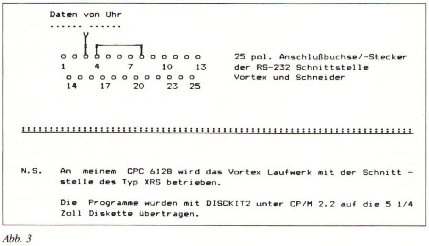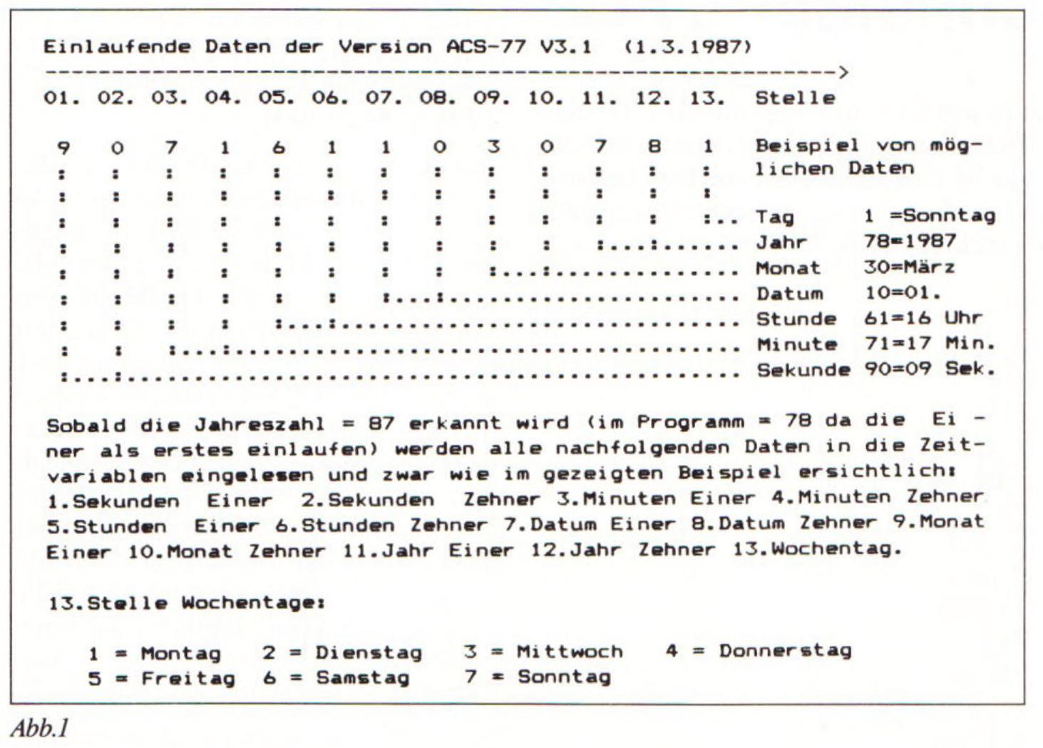 Die Uhr dient an meiner Amateurfunkstation seit Jahren zur Auswertung der Zeitsignale wie Steuerung von Tochteruhren nebst Auswertung der UT-Time. An die eingebaute V24 Schnittstelle kann der CPC über einen Inverter mit Transistor BC 317 angeschlossen werden, soweit dieser über eine serielle Schnittstelle verfügt. Geliefert wird eine Standardversion ACS-77 V3.1, die leider bei der Übertragung der ASCII-Zeichen am Ende der Zeitdaten kein CR/LF anhängt, welches in Verbindung mit Computern vorteilhaft wäre. Sonderversionen sind zwar erhältlich, aber es wird nicht daraufhingewiesen, so daß in der Regel die Standardversion ausgeliefert wurde. »Sollte die Ausführung mit CR/LF vorhanden sein, benutzt man dies natürlich zur Erkennung der Zeiteinlesung«, anstatt der Jahreszahl. Das Programmbeispiel 1 und 2 ist für eine »Vortex RS-232C Schnittstelle«. Im Programm 1 werden die Sekunden mit angezeigt, wobei sich das Programm 2 in Ihre eigenen Programme einbinden läßt. Funkamateure nutzen zur Auswertung die UT-Time, um die Zeit in die Logauswertung einzubeziehen. Damit sich die Besitzer der Schneider RS-232 Schnittstelle helfen können, wurde im »Programmbeispiel 3« die Schnittstelleneinstellung dargestellt. Einlaufende Daten der Version ACS-77 V3.1 (1.3.1987, s. Abb. 1) Sobald die Jahreszahl = 87 erkannt wird, (im Programm = 78, da die Einer als erstes einlaufen), werden alle nachfolgenden Daten in die Zeitvariablen eingelesen und zwar wie im gezeigten Beispiel ersichtlich: