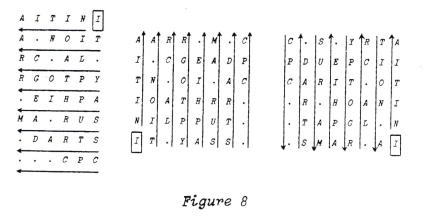 Si on considère l'alignement horizontal des lettres, on voit qu'il est possible de les regrouper en 6 nouveaux blocs (figure 7). Alignons ces blocs en séquence, et nous obtenons ceci IT.YASSCNILPPUTPIOATHRRCTN.OI.A.I.CGEAD.AARR.M. Intéressant, non ? Mais il y a des variantes encore plus performantes, qu'on peut combiner entre elles ; elles font appel à certaines des techniques que nous venons de voir, et qui prennent alors tout leur Intérêt. Dans le texte initial, supprimons d'abord tous les espaces (compactage) ; choisissons le nombre de lignes et de colonnes de la matrice (c'est-à-dire le nombre de caractères par bloc, et le nombre de blocs du texte en clair, tout simplement) en fonction de la longueur du message, éventuellement complété par des lettres nulles (mais pas des espaces). A l'aide de la matrice, extrayons les nouveaux blocs et alignons-les en séquence. Découpons maintenant cette séquence en blocs de 5 lettres, par exemple, et séparons-les par des espaces (expansion). Avec une matrice de 5 lignes x 8 colonnes (40 lettres, dont un E nul ajouté à la fin), nous obtenons finalement ceci (vérifiez, ce sera un bon exercice) : IAAYR.EMDNT.LPASS.CIIAT.PUTPT.OCOHR.RCINR.GIAAE Nous avons écrit le texte dans la matrice du haut vers le bas, toujours dans le même sens,à partir du coin haut et gauche et en alignant les blocs de gauche à droite. Nous aurions pu aussi bien partir du coin haut et droit, et aligner les blocs initiaux de droite à gauche, ou partir du coin bas et gauche en écrivant de bas en haut et de gauche à droite, ou enfin partir d'un angle quelconque et écrire alternativement le texte dans un sens, puis dans l'autre (figure 8).