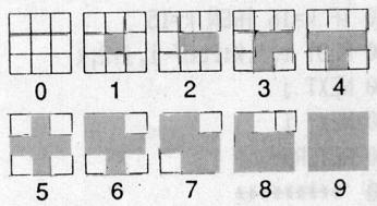 Nous vous donnons un petit catalogue de fonctions donnant de jolis résultats. Ne vous limitez pas à ces exemples : à partir de là, de petites modifications vous donneront des motifs totalement différents. Pour ceux qui ne disposent pas d'un moniteur couleur, ou ceux qui veulent une recopie d'imprimante, nous donnons une autre approche : la simulation de niveaux de gris, l'écran est divisé en cellules de 3 x 3 = 9 pixels, ce qui permet 10 niveaux :