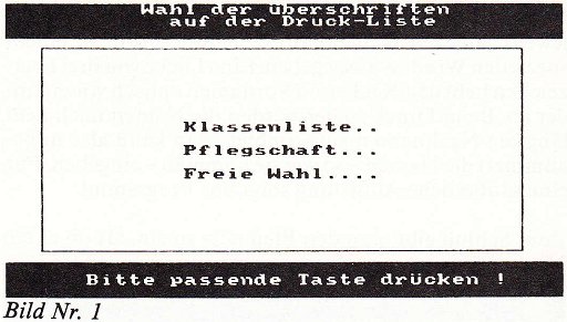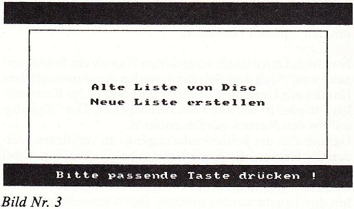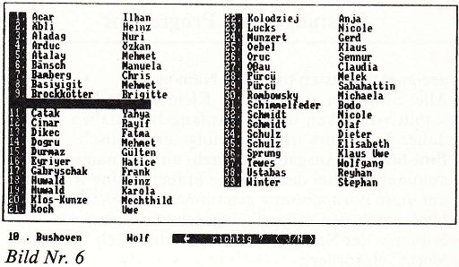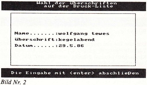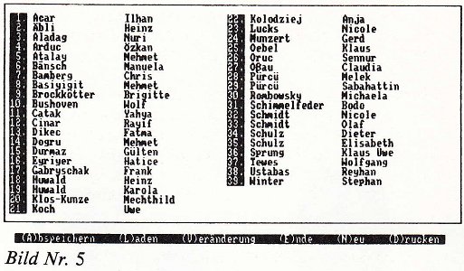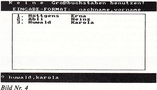 Drückt man z.B "F" für "freie Überschrift", so kann man den eigenen Namen, die Überschrift der Liste und das Datum der Ausgabe der Liste eingeben. Wenn man eine von den drei Möglichkeiten nicht ausfüllen will, kann man drücken (Bild Nr. 2)! Umlaute können eingegeben werden. Dabei gilt folgende Tastenbelegung:@ - > ß , [- > a , ] - > ö , / - > ü. Da man ja im Kleinschrift-Modus arbeitet, werden nur die "Klein-Umlaute" benötigt. Nach der Eingabe des Pfeils und wird die Liste geordnet. Zu dem Sortiervorgang Wegen der ASCII-Norm wurden Namen mit Umlauten falsch eingeordnet. Um dieses Problem in den Griff zu bekommen, muß man zu einem kleinen Trick greifen. Er besteht darin, daß vor dem eigentlichen Sortiervorgang z.B der Umlaut "ä" in "ae" umgewandelt wird. Gleichzeitig bekommt der Name, der diesen Umlaut enthält, die Feldnummer als Kennzahl ans Ende angehängt. Vorher wird der ursprüngliche Name in ein anderes Feld mit der gleichen Feldnummer umgeschaufelt. Gleiches geschieht mit den anderen Umlauten. Nun findet mit diesem veränderten Namen ein Sortiervorgang statt. Nach dem Sortieren werden die ursprünglichen Namen mit Umlauten - unter Verwendung der Kennzahlen - wieder in das alte Feld zurückgeholt. Die "Anhängsel" an den Namen werden entfernt. Um die Zeit der Schleifendurchgänge zu verkürzen, werden die Namen, die einen Umlaut beinhalten, schon bei der Eingabe der Namen mit einem "*" am Ende versehen. Dadurch erreicht man, daß nicht alle Namen auf Umlaute hin durchsucht werden müssen. Die Wartezeit beim Sortieren wird dadurch wesentlich verkürzt. Dies hat aber den Nachteil, daß der Programmieraufwand erhöht wird, insofern daß vor allen Bildschirm- und Druckerausgaben diese Sterne entfernt werden müssen. Auf dem Bildschirm erscheint nun die geordnete Liste. Nach all dem Mühsal, die der Computer mit den Umlauten hatte, übrigens in beachtenswerter Geschwindigkeit! In der untersten Zeile erscheint das Hauptmenue, das mannigfaltige Auswahl zuläßt. Z.B. ist hier Laden und Ab- Löschen - Hinzufügen - Beides. Wählt man eine der drei Möglichkeiten, so wird man in einem Window in den untersten Zeilen durch Abfragen geführt. Bei der Wahl "Hinzufügen" erscheint in einem Window der letzte Name der aktuellen Liste. Der weitere Ablauf gestaltet sich genauso wie bei der Eingabe der Namen. Dabei werden die Namen bündig zu dem letzten Namen ausgegeben. Ist jedoch der neue Nachname länger als der längste, bishervorgekommene Name, so werden die nun folgenden Namen nach diesem neuen Format ausgerichtet. Die gesamte Liste wird - für den Anwender unmerklich - umformatiert, so daß bei den späteren Bildschirm- bzw. Druckausgaben wieder alles im Lot ist. Bei der Wahl "Löschen" wird nach Eingabe des zu löschenden Namens und nach einer Sicherheitsabfrage ein breiter Balken über den betreffenden Namen gezogen (Bild Nr. 6). In allen Fällen erscheint am Schluß wieder die Liste in Mode 2 mit dem Hauptmenue. Nach der Wahl "Drucken" erscheint das Menue der Druckparameter, welches die Auswahl zwischen folgenden Optionen zuläßt: Mit/ohne Vornamen, Anzahl der Kopien, Schönschrift/ Normalschrift. Die Normalschrift ist dabei so eine Art Schnelldruck. Der Umgang mit diesem Menue wird im unteren Window erklärt (Bild Nr. 7). Nach dem Druck hat man dann die Möglichkeit, nochmals zu drucken, zu beenden oder ins Hauptmenue zurückzukehren. Bei "Neu-Druck" kann man per Menue die Überschriften und die Druck-Parameter verändern. Die Liste bleibt dabei unverändert. Auch hier wird das weitere Vorgehen speichern der Liste möglich (Bild Nr. 5). Nach der Eingabe werden die Namen, formatiert nach den jeweils längsten Namen, auf dem Bildschirm in einem speziellen Window ausgegeben. Eine Lücke von drei Leerzeichen hebt den Nach- und Vornamen optisch voneinander ab. Beim Druck später werden die Namen nach dem längsten Nachnamen ausgerichtet. Man kann also unbekümmert die Namen - so wie sie kommen - eingeben. Für eine säuberliche Auflistung sorgt das Programm! Zum Schluß gibt man den Pfeil < ! > so ein, als ob er ein Name wäre. durch einen erklärenden Text im unteren Window erläutert. Bleibt noch das Einlesen von schon abgespeicherten Listen zu erklären. Zu Beginn des Programms oder per Haupt-Menue hat man ja diese Wahl. Im oberen Teil des Bildschirms erscheinen die aktuellen Dateien der eingeschobenen Disk - und zwar nur diese! Andere Einträge dieser Disk werden nicht angezeigt. Leider sind sie nicht alphabetisch geordnet. Das liegt an dem CP/M- Befehl "dir". Die Alternative "cat", die bekanntlich alphabetisch sortiert, läßt die Beschränkung "*daf" nicht zu.