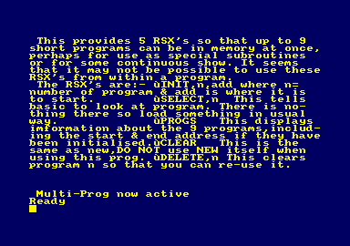 For all Those 464 owners who are annoyed at continually being ignored by Type-Ins contributors - this is for you. It's a fairly complex program that allows the storing of up to nine short Basic programs at once. The program sets up 5 RSX's: - |init, n, add - Each program is referred to by number When first run Multi Prog is looking at &170, the regular start of Basic slot, and all of the other slots are uninitialized. This routine initializes program space at address add for program number n. Make sure programs don't overlap, and also ensure that at least 2K is left below Himem to use the disk.