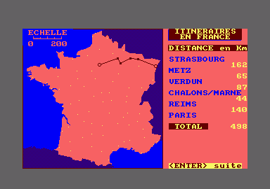 Vous allez partir en vacances sur les routes de France métropolitaine? ROUTARD va vous aider à choisir votre Itinéraire, simplifier les calculs de distance sur la carte. Et pourquoi ne pas en faire profiter vos amis? Routard a retenu 80 villes en fonction de leur taille, de leur intérêt touristique, ou comme étapes possibles. Affichez votre point de départ et votre destination, et il vous proposera un trajet, avec les principales étapes, les distances entre elles et la distance totale à parcourir. Il vous simplifie même l'affichage, en vous Interrompant dès qu'il est sûr d'avoir compris le nom de la ville,... ou dès qu'il est certain que vous vous êtes trompél Et vous verrez comment II s'y prend pour les deux CHALON(S), ou pour les noms de ville commençant par SAINT. Ceci dit, l'itinéraire qu'il trace n'est qu'une proposition: à vous de trouver, si vous le souhaitez, un trajet plus court (sans prendre l'autoroute, par exemple) ou plus sinueux. Pour cela, indiquez l'étape par laquelle vous voulez passer au lieu de la destination; une fois le trajet affiché, tapez S pour tracer la suite de votre itinéraire. C'est ça le tourisme à la carte! Si vous êtes un peu effrayé par la masse des DATA des lignes 2710-4300, commencez par ne taper pour chaque ligne que DATA suivi de 39 virgules; vous compléterez au fur et à mesure de vos besoins. S'il lui manque des données, votre CPC vous le fera savoir! Vous avez en effet certainement compris qu'il a besoin de 80 nombres-codes (deux lignes de 40) pour chacune des 80 villes de sa liste, répartis dans une sorte de tableau à double entrée: chaque code représente soit la distance qui sépare votre point de départ de votre destination, soit l'étape suivante sur le trajet correspondant. Quant à la liste impressionnante de RESTORE (lignes 1210-2000), elle permet d'accélérer le programme, en évitant d'avoir à lire l'intégralité des codes précédant celui recherché. Si votre ville ne figure pas dans la liste, pourquoi ne pas l'y rajouter? Il suffit qu'elle soit à plus de 31 km (impératifl) de la ville la plus proche de la liste. Voici comment vous allez procéder: Repérage sur la carte Déterminez l'emplacement de la ville sur la carte: vous repérerez son abscisse et son ordonnée en vous aidant de celles des villes de la liste (lignes 2480-2670) situées sur la même verticale, et de celles situées sur la même horizontale sur une carte de France. Complétez alors ainsi la ligne 190 de DESSFRAN.BAS: 190 NEXT I: PLOT (abscisse), (ordonnée), 3: GRAPHICS PEN 1 Introduction d'une 81ème ville dans le programme lignes 170 et 310(...):FOR 1=1 TO 82:(...) 80 IF D1110 ON P GOTO 1120,1130, 1 140,1150,1160,1170,1 180, 1190,1200 Pour que l'Itinéraire puisse partir de votre ville, ajoutez deux lignes de DATA (4310-4320) en fin de programme, pour loger les 80 codes correspondant aux 80 villes déjà sur la liste, et ajoutez le code 0 (distance de votre ville à elle-même!) à la ligne 4320. Comment calculer chaque code? C'est facile! S'il n'y a pas de ville intermédiaire, notez simplement la distance entre les deux villes, augmentée de 50 (votre CPC lira tous les nombres inférieurs à 82 comme des codes renvoyant à la ville correspondante sur la liste, et les autres comme des distances après leur avoir oté 50). Sinon, notez le numéro de code de la ville-étape la plus proche (1-80) par où passer pour commencer le trajet. Par exemple, c'est AUCH que vous voulez rajouter. Tapez alors: Pour que l'itinéraire puisse arriver à votre ville, il faut procéder de même en fin des lignes de DATA 2720,2740, 2760,2780,etc... Toujours dans l'exemple de AUCH, rajoutez avant le nom de la ville précédé du signe ' : Enfin pour que l'Itinéraire puisse passer par votre ville, assurez-vous d'abord que vous en aurez besoin, car c'est un peu plus compliqué. Sinon ne soyez pas surpris que votre CPC traverse votre ville sans s'y arrêter. Reprenons notre bonne ville d'AUCH. Faisons l'Inventaire des villes reliées directement par route: AGEN déjà nommée, BORDEAUX, CAHORS, MONT DE MARSAN, PAU, RODEZ et TOULOUSE. Le seul itinéraire traversant AUCH est la route MONT DE MARSAN-TOULOUSE. Toutes les autres routes s'arrêtent à AUCH. Il faut donc remplacer dans les lignes 3630-3640 tous les codes 75 (TOULOUSE) par le code 81 (AUCH). De même en sens inverse. Il faut remplacer dans les lignes 4190-4200 tous les codes 67 (RODEZ) par le code 81 (AUCH). Ainsi ferez pour tous les Itinéraires passant par votre ville. Après quoi, tracez votre route, en voiture, et bonnes vacances! Vous les avez bien méritées! Le premier listing DESSFRAN.BAS est destiné créer la carte de France ROUTES.SCR. Si vous travaillez sur cassette. ROUTES.SCR devra trouver place après le listing ROUTARD.BAS.