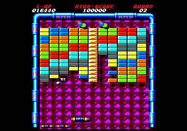 Bon. Dans le premier ARKANOID, nous avions la raquette double, la raquette "aimantée", la raquette laser, la raquette supplémentaire et puis il y avait le multiba-balle, la sortie de tableau anticipée, le ralentissement.. Des options qui nous ont amusé, non ? Si. Nous retrouvons toutes ces joyeusetés sur ARKANOID II, mais ce n'est pas tout : une double-raquette (deux raquettes côte à côte), une mini raquette (bonjour la galère), un multibaballe un peu spécial à trois balles et un autre à six balles, une raquette laser à tir automatique, une raquette "spectre" avec un très bel effet de dédoublement et une balle rouge très destructrice. Certaines options peuvent se combiner, par exemple un multibaballe rouge est très efficace. MAIS CAISSE TU FAIS DOH-DOH DIS DONC ? L'agencement des tableaux d'ARKANOID II est assez original et nous retrouvons parfois des écrans ressemblant étrangement aux tableaux les plus durs du précédent ARKANOID. La nouveauté vient des briques indestructibles, de celles qui disparaissent temporairement, sans parler de celles qui se meuvent, à peine frappées par la balle. THE REVENGE OF DOH est fait dans le même moule que son prédécesseur ; il est toujours dur de faire une suite à un hit, celle d'ARKANOID est de très bonne facture et ne décevra pas ses nombreux adeptes.