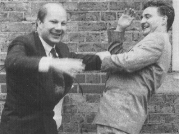 Ian Stewart (1991) , boss of Gremlin, relaxing in his Sheffield Offices. You can't See Here, but this is perhaps the biggest room in the building - Gremlin's long , thin offices contain a string of tiny self-contained work areas, each the size of small bedroom. |  David Ward (left) shows the kind of form that's Ocean to the top in a breif encounter with Gremlin boss Ian Stewart |