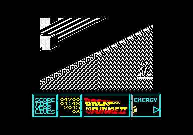 Cela pourrait être un des raisonnements de Doc dans la fantastique saga des Retour vers le futur, le film. Imaginez un peu : vous connaissez à l'avance votre avenir. Vous jugez, vous réfléchissez, et vous décidez de modifier le cours de l'histoire. Arrêtons là les suppositions et voyons à quoi ressemble le jeu. CINQ JEUX EN UN Le héros, Marty McFly (vous), se trouve en 2015 dans les rues de Hill Valley. Equipé de son hoverboard (sorte de skateboard à propulsion électromagnétique), il doit arriver le plus vite possible à la mairie de la ville pour empêcher une catastrophe qui doit arriver à son futur fils. Les rues sont infestées de loubards, de chiens, de voitures et de mamies qui traversent les rues sans crier gare. Il faudra bien sûr éviter tout ce beau inonde. Plus tard, Marty devra faire sortir Jennifer (c'est la nana du film et sa copine en même temps) de chez elle. Pour cela, il doit contrôler l'ordinateur qui gère les entrées-sorties, une scène assez rasoir, je l'avoue. Encore plus tard. Marty devra rectifier une erreur dans le passage du temps : ainsi. il lui faudra faire un saut dans le passé (par rapport au futur dans lequel il est), en 1985. Encore plus tard qu'encore plus tard. Marty devra reconstituer sa propre image qui s'est complètement emmêlé les pattes. En gros, vous avez droit de jouer à un Taquin contre la montre. 'Pour finir, et trois fois encore plus tard, Marty se trouve en 1955. C'est l'époque du yéyé et autre houla-houp. Il doit échapper aux griffes de son plus grand ennemi. Biff.