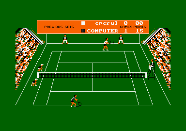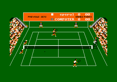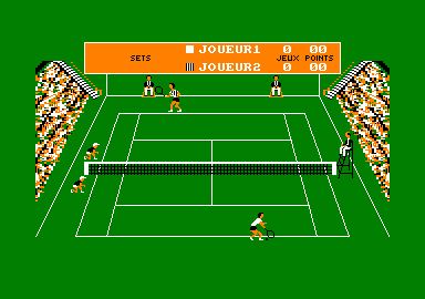 Elle relève la tête et, avisant mon accoutrement, me dit : 'Tiens ?! Un mec d'AMSTRAD 100% qui fait un reportage sur le tennis !" Je m'incline devant un tel sens de l'observation et lui épingle un micro cravate dans son décolleté. La discussion est banale, ce n'est que plus tard qu'elle m'avouera posséder un CPC ; elle améliore son coup droit avec un soft qui s'apelle MATCH POINT (la version anglaise de BALLE DE MATCH. Il faut d'ailleurs souligner la justesse de la traduction ! Si, si.) Le jeu est en mode 1, c'est-à-dire le mode graphique moyenne résolution de l'Amstrad CPC avec quatre couleurs... C'est largement suffisant pour représenter un court de tennis, deux ramasseurs de baballes, un arbitre sur sa chaise, le public et les joueurs. Bien que les deux tennismen, au premier plan et en fond de court, soient de même hauteur, l'effet de profondeur du court est bien rendu. Le grand intérêt est que, bien sûr, on peut jouer à deux simultanément Si vous ne possédez qu'un seul joystick, le copain devant jouer au clavier sera très désavantagé. Par contre, avec deux manettes, le plaisir de jeu est immense.