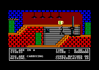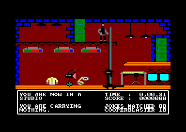Basildon Bond is the creation of comedian Russ Abbott and, along with some other of Russ's characters, he is the star of this exploration and joke solving game. The aim is to rescue Russ from a rival comedy act by putting together some of the oldest jokes known to man. The action takes place in the TV studios, where jokes and answers are to be found by searching the various bits of equipment and furniture. You control Bond as he runs around the 2D rooms that make up the studios, and although the character is rather chunky he is animated quite nicely. The rooms are colourful, but again tend to be on the blocky side. There are many objects to be found lying around the studios such as video tapes, TV remote controls, earphones and electric kettles, most of which are used for searching furniture. To search a piece of furniture Bond needs a specific object. Which particular object searches which bit of furniture has to be discovered by trial and error. The combination stays the same throughout a game but, changes for each new game. To get between rooms Bond merely has to run mto a door which will creak open and take him to the next room. Some rooms have different levels of platforms to explore and these are connected either by stairways or boom cameras that can be moved up and down like lifts. The playing area is quite large and a fair bit of exploration and mapping is required. Many rooms have killer camcras that patrol up and down the floor and platforms, and these are Bond's main dangers. If he runs into them he's sent back to the start room and loses ten minutes off the five hour time limit. They can be stopped in two ways: either by having a magnet in the same room which freezes them, or by using a Cooperblaster. Cooperblasters are limited in supply but cause either Cooperman or Blunder-woman to appear on screen. One of them bounces diagonally around the screen, killing any cameras it comes into contact with, and the other moves straight across the screen while you move it up or down, trying to hit a camera. Once you find part of a joke it has to be taken back to the start room and logged into a computer before 'the face' appears and gets you, removing the joke back to its starting position. Once logged, the jokes and answers have to be matched up to provide the jokes in all their ageing glory, and believe me they are older than Max Bygrave's.