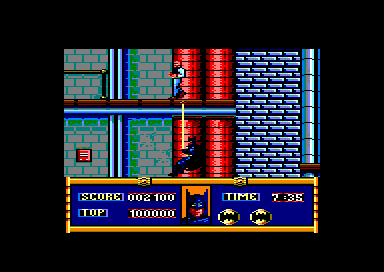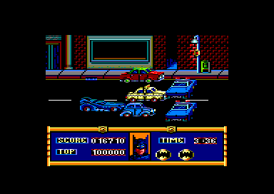 Tout commence dans une usine chimique infestée de gangsters qu'il faut éliminer à l'aide de votre Bata-rang et de votre Batcorde (chez nous, ça s'appelle un grappin). Leur chef, Jack Napier deviendra le Joker après qu'un maladroit l'ait malencontreusement poussé dan s une cuve d'acide (c'est pas moi m'sieur, c'est Batman !). Vous poursuivrez ensuite le Joker à bord de ia Bat mobile dans les rues de Gotham City, prenant des virages à 30 °, grâce à un grappin relié au véhicule qui s'enroule autour des lampadaires. Parvenu à la Batcave, vous devrez découvrir dans une sorte de Master Mind simplifié, les produits de beauté contaminés par le Joker. Vous vous envolerez ensuite dans la Batwing afin de couper les cordes qui retiennent des ballons remplis de gaz mortel au dessus des rues de la ville. Pour finir, vous grimperez jusque sur le toit de la cathédrale où vous affronterez enfin le Joker. Le logiciel comporte donc cinq parties, soit quatres jeux différents (la première et la dernière partie étant basées sur le même principe) très bien réalises et tous plus prenants les uns que les autres. Mais le problème majeur est qu'il est très difficile de passer ne serait-ce que la première séquence. On sait combien il est désagréable de payer un logiciel 150 francs (même si l'autocollant Batman inclus dans la boite est "gratuit" comme le précise sans rire la jaquette) et de ne jamais voir plus d'un cinquième du jeu. M.L , Micro News 026 - Novembre 1989