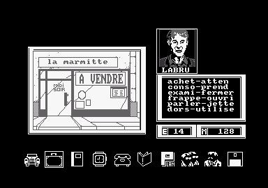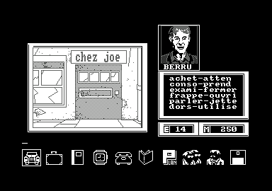 PREMIER OBJECTIF, REPERER UN PEU LES LIEUX, MATER UN PLAN. Ensuite, trouver un téléphone et localiser Max . Paraîtrait qu'il y a ici, quelques hôtels, un garage, un musée, une armurerie, un bar-tabac, bref des boutiques, et quelques baraques à visiter, histoire de se faire un peu d'argent de poche avant de pêcher un poisson plus gros ! Allez, je sors du bar, je prends ma tire et je me balade un peu, en faisant gaffe à la jauge. Ça y est, j'ai repéré le bar-tabac, voyons un peu les “news ”. Journal du mercredi... gros titres : “LA COLLECTION INDIRA AU MUSEE DE LA VILLE". Intéressant, poursuivons...” La célèbre collection de joyaux de l'émir Sheikbal sera présentée dans la salle des icônes du Musée de la ville. Les habitants pourront venir admirer cette splendeur, pendant tout le week-end... “ TRES intéressant, cela me laisse 2 jours pour préparer quelque chose... Un coup de tube à Max, s'impose. Heureusement, y a une cabine tout près. Consultons l'annuaire, Elit snack... voyons.ah ! le 2220. - “Allo, Max ? “ Allez, moi aussi, je m'jette. La journée a été longue, une chance que dans cette ville, je ne me sois pas encore fait tirer mon larfeuille, ou arrêter par les keufs. Bon, il serait temps de trouver un hôtel sûr, car pour un coup comme celui qui va se préparer, faut être en forme, ça n'arrive qu'une fois, et si on le rate, ce sera toujours une fois de trop ! ! ! SI VOUS CHERCHEZ DE L'AMBIANCE, STYLE POLAR NOIR ET BLANC des années 40, pour sûr Arthur, vous en trouverez ! Vous jouez le rôle d'un petit malfrat, dont vous pouvez décider de l'état civil de départ. De plus, vous devrez répartir 20 points sur 3 caractéristiques : Force, Dextérité, Endurance. Une fois, ce personnage défini, (et sauvegardé, je vous le conseille), vous retournez pour la PREMIERE fois votre disquette et vous vous retrouvez devant le Bar de chez JOE. Votre écran est alors divisé en 5 parties principales : 1) la fenêtre graphique : le bar sur une moitié d'écran gouache, UN PETIT PROBLEME S'INSTALLE ILLICO, le jeu étant constitué de 2 disquettes, chaque fois que vous passez d'une phase à l'autre, vous avez UNE manipulation à faire, sur UNE des QUATRE faces... Le deuxième accroc, c'est que si vous mourez, ce qui arrive assez fréquemment, du moins au début, vous avez à vous fader toute la présentation, bah, mon colon, c'est long ! Passé le cap des jongleries de disquettes, le jeu s'avère assez plaisant en réunissant plusieurs qualités : un bon graphisme dans tous les lieux et pour tous les personnages, même si un peu de couleur aurait été la bienvenue, pardon le bien venu, comme dans “Zombi", bien sûr, qu'on est obligé de citer, non pas pour évoquer un plagiat, mais comme une référence de qualité; une bonne phase de “plan" et d'exploration; et une phase d'aventure où le temps est un facteur essentiel et maîtrisable, ce qui est rare dans les jeux. Vivre dans la peau de quelqu'un qui mange, boit, dort, lit le journal du jour et prépare des plans pour la suite, dans un univers dangereux, voilà le huis-clos urbain , qui vous attend avec “Big band ”. NOTE, TECHNIQUE : 14/20 NOTICE: 11. Trop succime, ne mettant pas dans l'ambiance. Amstradebdo n°8 |