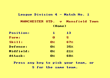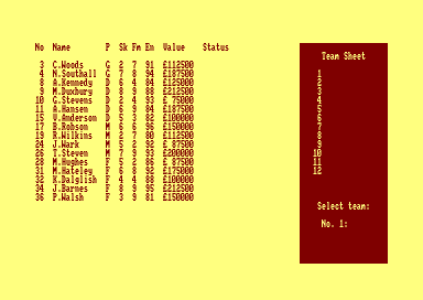 This is the best of the football management simulations on the market and now it's available in disk form it has been given several enhancements that make it even better. It places you in the role of a team manager who starts with his team in the fourth division and has to take them through each game handling team selection, transfers, club finances and then watching the nail-biting highlights as the games are played. The disk version has a number of noticeable improvements. There is now an FA Cup competition that runs throughout the season and contributes to your managerial record, featuring all the rounds and replays. The 3D highlights of each game have also been improved with different strips available (hoops and stripes), penalties which are saved occasionally and much faster animated action. After a game there is also additional club news that can be good or bad financially. Another improvement is the ability to keep the team that played in a previous game and not have to reselect it every time. All these features add to the excitement and depth of the game with the only drawback being the added time that accessing the disk drive puts onto the game. If you're a football fan this is a must. If you're not, give it a look anyway. BW, AA