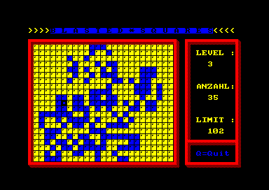 Blasted Squares Brettspiel mit Tücken Es handelt sich bei diesem Programm um ein Brettspiel; gezogen wird auf einer karierten Fläche. Zunächst sind alle Felder gelb. Anschließend wählt der CPC zufällig Quadrate von 3x3 Kästchen Kantenlänge aus und invertiert diese neun Felder; alle gelben werden dann blau und umgekehrt. Je nach Schwierigkeitsgrad erfolgt dies für 30 bis 200 Quadrate. Die Aufgabe des Spielers besteht nun darin, aus dem Durcheinander von blauen und gelben Kästchen durch erneutes Invertieren alle in gelbe umzuwandeln. Dazu bewegt er den Cursor mit Hilfe des Joysticks auf ein beliebiges Feld innerhalb der Spielfläche (mit Ausnahme der Felder direkt am Rand). Durch Druck auf den Feuerknopf werden dieses und die acht Nachbarfelder erneut invertiert. Die dazu notwenige Routine ist aus zeitkritischen Gründen in Maschinencode geschrieben. Das einheitlich gelbe Spielfeld ist mit der durch ein Limit vorgegebenen Anzahl von Drehungen wiederherzustellen. Außerdem werden im rechten Fenster der Level und die Anzahl der benötigten Versuche angezeigt. Durch Druck auf die Taste Q läßt sich das Spiel vorzeitig beenden. Armin Vahrenhorst , Schneider Magazin