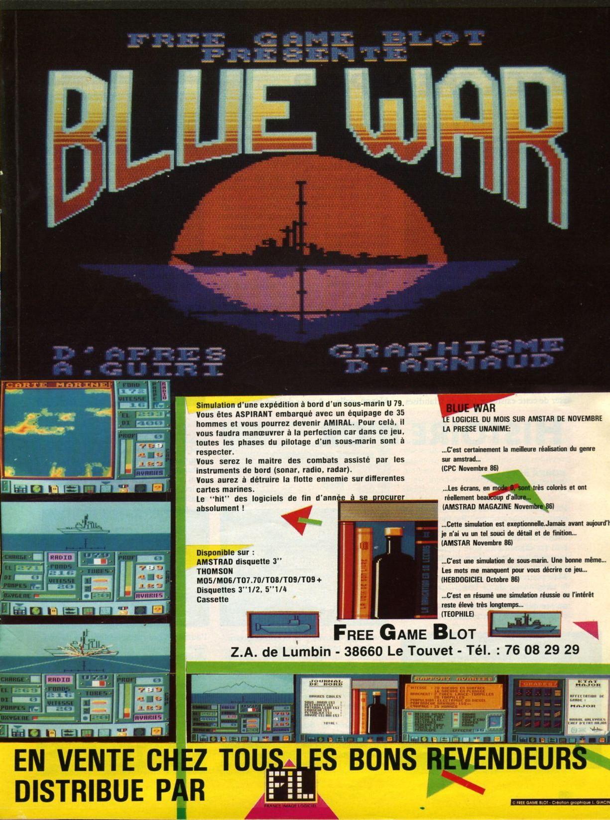 Un tour en sous-marin, cela vous tente ? Si vous ne connaissez rien de cet univers où il ne fait pas bon être claustrophobe, nous vous conseillons vivement de vous procurer Blue War : c'est certainement la meilleure réalisation du genre sur AMSTRAD et... le meilleur produit de la gamme Free Game Blot. Un graphisme très réussi, des couleurs et une mise en scène remarquables en font un jeu passionnant. Tout a été fait dans le souci du détail. L'utilisateur appréciera. Les sélections des différentes fonctions se font par icônes. Un mode d'emploi résumé est accessible par ce moyen. Il y a 9 écrans différents : le kiosque, le radar, le livre de bord, les navires ennemis, les avaries, les cartes de navigation, les grades fonction de vos résultats, la radio de bord dont le haut-parleur égrène ses signaux morse. Tout est d'un réalisme saisissant et d'une utilisation fort simple. Votre mission consiste à anéantir une partie de la flotte ennemie sans vous faire détruire. La stratégie et l'adresse se mêlent intimement. Un seul mot pour conclure : bravo aux auteurs de Blue War. |
