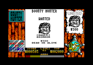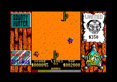 Time to get out and round up the bad guys in this smart offering from Code Masters. Out there in the wild west streets, deserts, and canyons are some of the meanest mothers around. We're talking about the likes of Jack Nikolat, Charles Bronkan, Clint Westwood, and even the mighty Kodak. As bounty hunter extraordinaire, your quest is to go get 'em for a price. Each of your opponents are clearly displayed at the start of the twelve stages, along with the price on his head. Watch out forthe Indian knives and stray bullets, and be sure to pick up the extra gun, ammo and money lying around. Bounty Hunter is extremely playable, with plenty of action to hold interest, especially in the shoot-outs. Go get 'em pard. ACU #9009