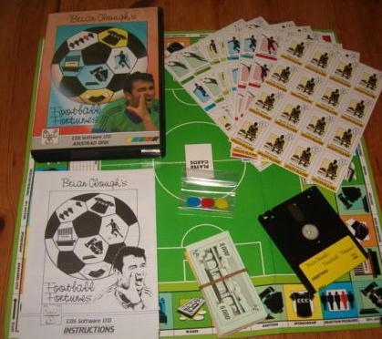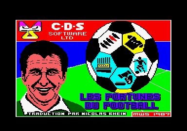 Astucieux ; le boîtier renferme le logiciel, une plaque de jeu cartonnée pliée, des feuilles de pion, et des billets. Il s'agit en effet d'un jeu de société assisté par ordinateur, où vous êtes à la fois entraineur et président d'un club de football. L'ordinateur gère vos finances et le résultat des matchs, plus quelques autres petits services. Une excellente idée, mais le hasard joue une trop grosse part, et les affichages sont pour le moins pauvrets... A encourager quand même ! |