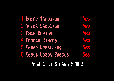 On découvre ainsi par ordre totalement subjectif : le lancer de couteaux sur cible mouvante et vivante, le tir sur cibles sortant de terre, un ball-trap improvisé avec des bouteilles en guise de pigeons d'argile. On vous propulse ensuite sur un cheval à la poursuite d'un veau dans le but évident de stopper la pauvre bête (le veau, pas le cheval) d'abord avec un lasso puis sans lasso. Pour vous remettre, un petit séjour sur le dos d'un cheval sauvage vous fera le plus grand bien. On termine par une petite poursuite de diligence avec neutralisation de l'indien qui s'en est emparé.