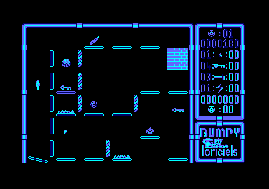 Bumpy, c'est une petite boule très sympa à tête humaine (une sorte de cousine du génialissime Wizball, ou un semblant de petit chat rondouillard). que vous pouvez déplacer en la faisant rebondir sur une multitude de plates-formes. C'est tout bête dit comme ça. mais sachez que certaines plates-formes vous transforment en miettes, que d'autres s'accrochent à vous comme un aimant, et que les plus venimeuses rétrécissent (jusqu'à disparaître) sous vos pieds. Erîfia façon de parler, car je devrais dire sous la tête de votre adorable Bumpy. Mieux vaut donc ne pas s'attarder sur ces dernières plates-formes, et bien préparer votre coup avant d'attaquer le tableau, à moins, bien sûr. que vous ne connaissiez le parcours sur le bout du joystick. Ah, j oubliais la présence de plates-formes inclinées, véritables Bump-pièges. Heureusement, si vous êtes bloqué à un certain endroit du jeu, la touche Suicide (= "S") permet de continuer la partie. En appuyant sur "Feu" (barre d'espace pour les joueurs clavier), Bumpy peut sauter, et même ralentir en vol. Pas de problème, les déplacements sont à la fois éclatants et faciles d'accès. UN BUMPY Bumpy croise en route un grand nombre d'objets possédant chacun un pouvoir particulier : les bouteilles donnent une vie supplémentaire, le marteau détuit les murs, les gouttes éteignent les feux destructeurs, et les clés explosent les poteaux. Attention, ces derniers ne demandent pas tous le même nombre de clés. Certains s'ouvrent avec trois différentes. Alors, si vous le pouvez, choisissez de préférence les plus faciles à détruire, et ne laissez surtout pas de clés en chemin. Pour ce qui est des autres objets rencontrés (de formes bizarres : choux-fleurs, fruits, poissons, chopes de bière, pas d'inquiétude à avoir, Bumpy ne mourra pas de faim...), ne vous affolez pas, ce ne sont que des bonus. Donc, ne les loupez pas si vous jouez à deux. A ce sujet, vous pourrez remarquer, si vous achetez ce soft, que le temps n'apparaît pas sur l'écran au côté des scores et du nombre d'objets emmagasinés. Finir les tableaux au plus vite rapporte pourtant plus de points que visiter les bump-villes en traînant EH BIEN OUI, L'auteur de ce soft (J.-F. Streiff) est un sacré malin. En effet, il est possible (en appuyant sur la touche "D du clavier en début de partie) de jouer les tableaux totalement dans le désordre. Une bonne manière, grâce à ce mode découverte, de voir l'ensemble des pièces que peut visiter Bumpy, et ce, sans être un véritable bump-maltre. Et puis, si vous devenez un véritable bump-dieu, et que les dédales et feintes du soft n'ont plus aucun secret pour vous, vous aurez la possibilité d'éditer vos propres tableaux (version disc uniquement, dommage pour les possesseurs de lecteurs K7). Bon, moi qui suis totalement inapte en programmation, je me suis créé des tableaux du tonnerre. Mais attendez, cette option est tellement bien que je passe derechef au paragraphe suivant.
