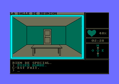 Sauvegarde Sauvez le premier listing Basic sous un nom de votre choix (« PROOT », par exemple) et entrez les codes hexadécimaux du second par le programme Amsaisie (reportez-vous à son mode d'emploi). Spécifiez 7530 comme adresse de début et sauvegardez par ioption « S » sous le nom « PR-LM ». Si le courage vous manque pour saisir en une seule fois les 13 ko de ce fichier binaire (ouf!), morcelez votre travail en plusieurs fichiers (PR1, PR2, etc.). Ces derniers devront ultérieurement être chargés à la suite après un MEMORY &752F et sauvegardés ainsi dans un fichier unique: SAVE"PR-LM", b, &7530,&310BLe personnageAgent spécial du PET (Protection Establishment vs Terrorism) - organisation secrète mondiale, dont le but louable est de contrer le monde criminel dans son influence néfaste sur la destinée des états -, Johnny Proot est, à juste titre, l'ultime recours qui n'intervient qu'en cas de danger extrême. Guérillero hors pair, maître armurier, expert en explosifs et relativement intelligent pour un héros, il se doit, une fois instruit de sa mission, de mener celle-ci à terme coûte que coûte. La mission (message du chef suprême) — Bonjour Johnny. Vous sachant au mieux de votre forme, je fais appel à vous pour éviter, si possible, une nouvelle crise mondiale. Je m'explique. Votre ennemi mortel, le général Zorglub, persiste à vouloir devenir le maître du monde. Pour ce faire, il a mis au point une nouvelle bombe indétectable et miniaturisée, avec laquelle il compte exercer un odieux chantage à l'attentat. Fort heureusement et à notre connaissance, il n 'existe qu 'un seul exemplaire de l'engin meurtrier, encore à l'état de prototype. Nous savons de Marseille, heu, également, qu'il tiendra dans son bunker et devant son état major au grand complet, une réunion importante afin d'exposer son plan diabolique. Bref, votre mission, que je vous ordonne d'accepter, consiste à détruire cette bombe et par la même occasion, le général et ses acolytes. Vous serez parachuté devant le bunker au moment précis de la relève, afin de vous éviter un échange de politesses avec les 250 gardes qui patrouillent 24h sur 24 dans le parc. Du fait de ce choix stratégique, vous n'aurez que 10mn pour agir, à savoir: découvrir le moyen d'entrer discrètement, puis rechercher notre agent retenu prisonnier (à qui l'on doit les informations que je viens d'évoquer) et qui pourra certainement vous aider à trouver la bombe. Une fois en possession de celle-ci, rejoignez la salle de réunion et faites-la sauter. J'allais oublier. Ne pourront être utilisés que les éléments se trouvant sur place (en effet, un système de détection de métaux entoure le bunker). Un conseil d'ami, débrouillez-vous pour découvrir un moyen de locomotion vous permettant d'échapper à l'explosion. Sachez en outre que le bunker comprend un peu moins de cinquante pièces. Malgré tout, bonne chance Johnny P.S. (avant autodestruction du document) Pour entrer, une idée me vient: faites-vous ouvrir la porte par un garde et ensuite, éliminez-le...