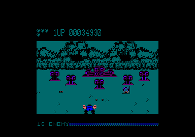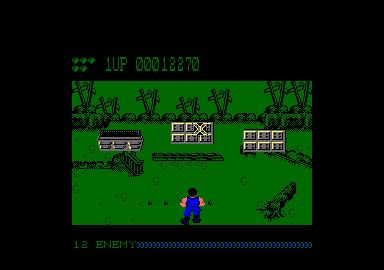Si votre armement semble au début un peu faible face aux hordes d'ennemis que vous avez en face de vous, il faut quand même savoir que vous allez pouvoir en récupérer sur place comme des grenades ou une mitrailleuse. Mais, attention, elles ne sont disponibles que pendant un court instant. Aussi, vous devez être très vigilant durant tout votre parcours qui s'étale sur 5 niveaux, sachant que chaque niveau est constitué de 4 phases. De plus, la fin de chaque phase sera ponctuée par la destruction d'un adversaire redoutable. Enfin, vous ne disposez que d'un seul crédit alors n'hésitez pas à vous protéger derrière les morceaux de bâtiment tant que cela est possible. AMSTAR n°48 Août 1990 |