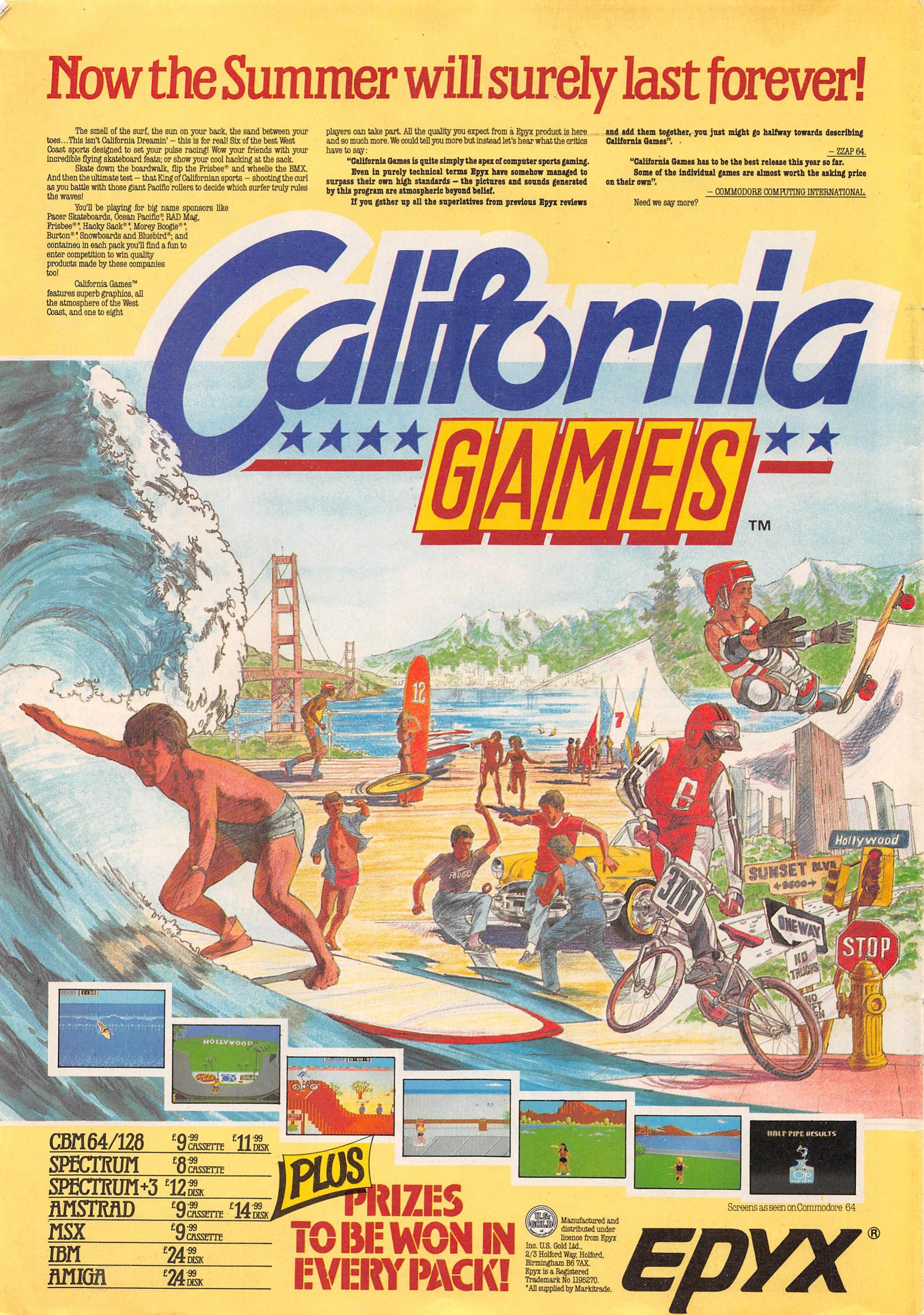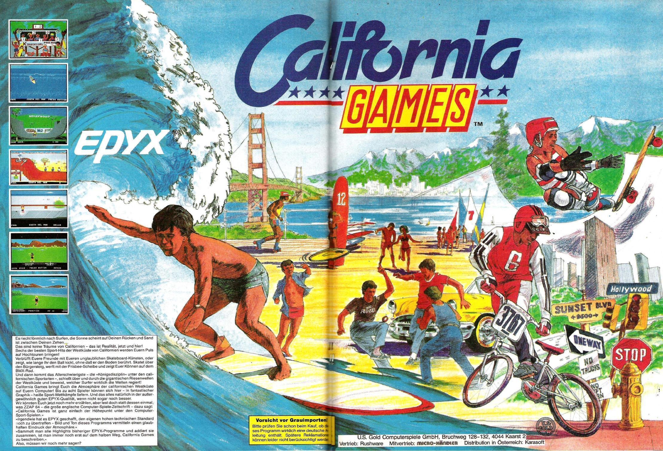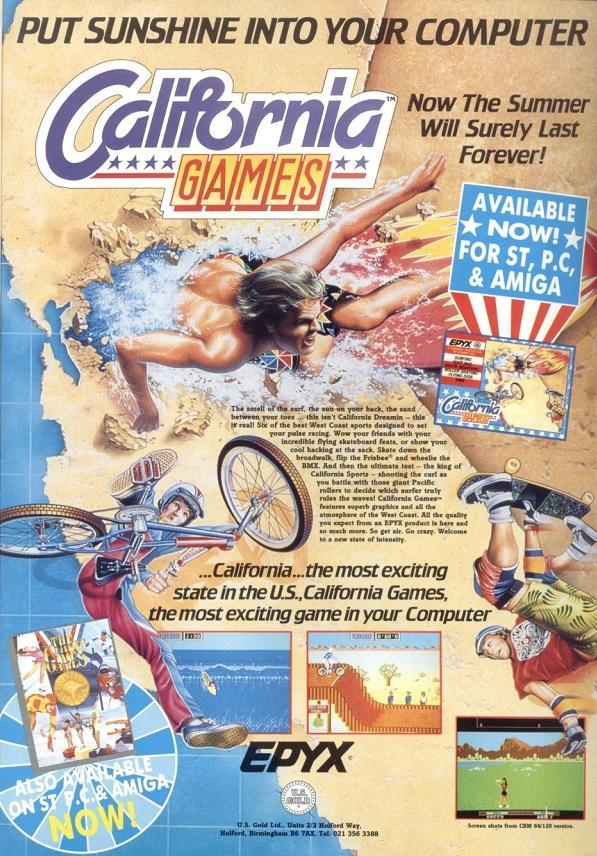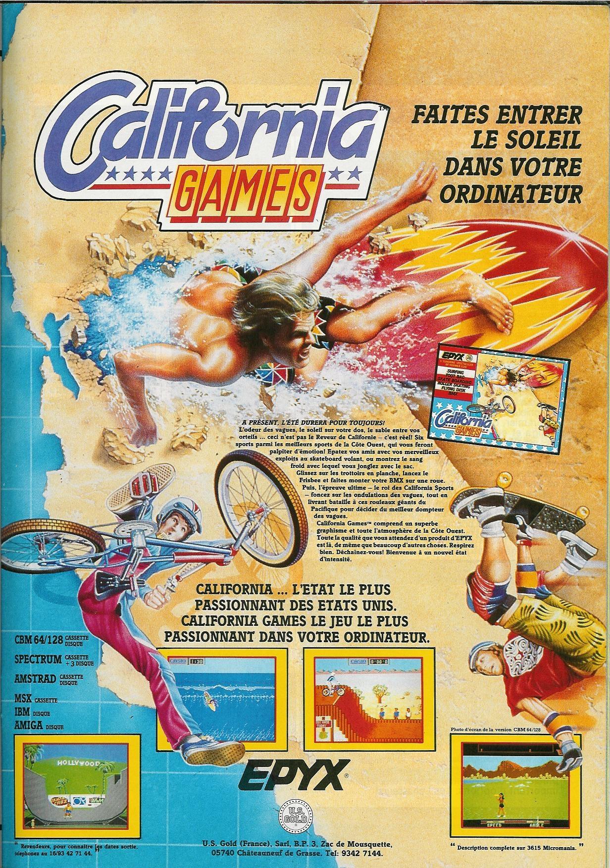 C 'est ainsi que tout le monde attend au tournant les sorties de chez Epyx World Games le successeur ne cassait pas des briques (normal c'est pas un casse-briques), nous avons été déçus. Aucune innovation, des gra phismes moins bons ... Et voilà que sort California Games sur 464. Une animation supérieure, et des décors moins satisfaisants, L'un dans l'autre ça s'équilibre.