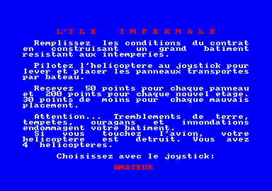 Contre les éléments naturels, votre tâche de construire un puit en mer du Nord, pour se faire, vous disposez d'un hélicoptère pouvant transporter des blocs préfabriqués, nécessaires à la construction. Mais aller d'un navire vers ce qui ressemble à un château de carte n'est pas de tout repos lorsque tempête et ouragans de déchaînent...