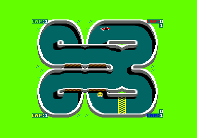 Edition spéciale Allez, va pour l'éditeur. Munis d'un joystick, nous allons modifier un circuit existant. Pas la peine de compulser le mode d'emploi ( en français ), rien de plus simple. Sur le côté droit, une fenêtre permet par simple scrolling de choisir la pièce à poser. Il ne reste plus ensuite qu'à la positionner et à appuyer sur feu. Le temps de régler quelques détails et la course va pouvoir commencer. Il faut tout d'abord s'assurer de la cohérence du circuit. Une option permet de le faire. Ensuite, ajoutons une pincée de cyclones, quelques plaques d'huiles, eau ou gravillons ( seul leur nombre est déterminé, les plaques apparaissent au hasard ). Voilà, je sauve mon circuit sur une disquette et en avant.